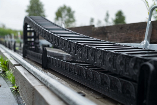 Con el apoyo de los expertos de OEM Automatic, Lundström encontró lo que buscaba en igus, una empresa de Colonia experta en plásticos técnicos para movimiento. igus desarrolla cadenas portacables hechas de plásticos de alto rendimiento para aplicaciones industriales desde hace décadas. El dispositivo de riego automatizado de Södra está equipado con el sistema de cadena portacables de la serie E4.1R, que actúa como una especie de protección móvil y garantiza que las mangueras de agua se mantengan en la posición correcta mientras siguen los movimientos del sistema de riego.