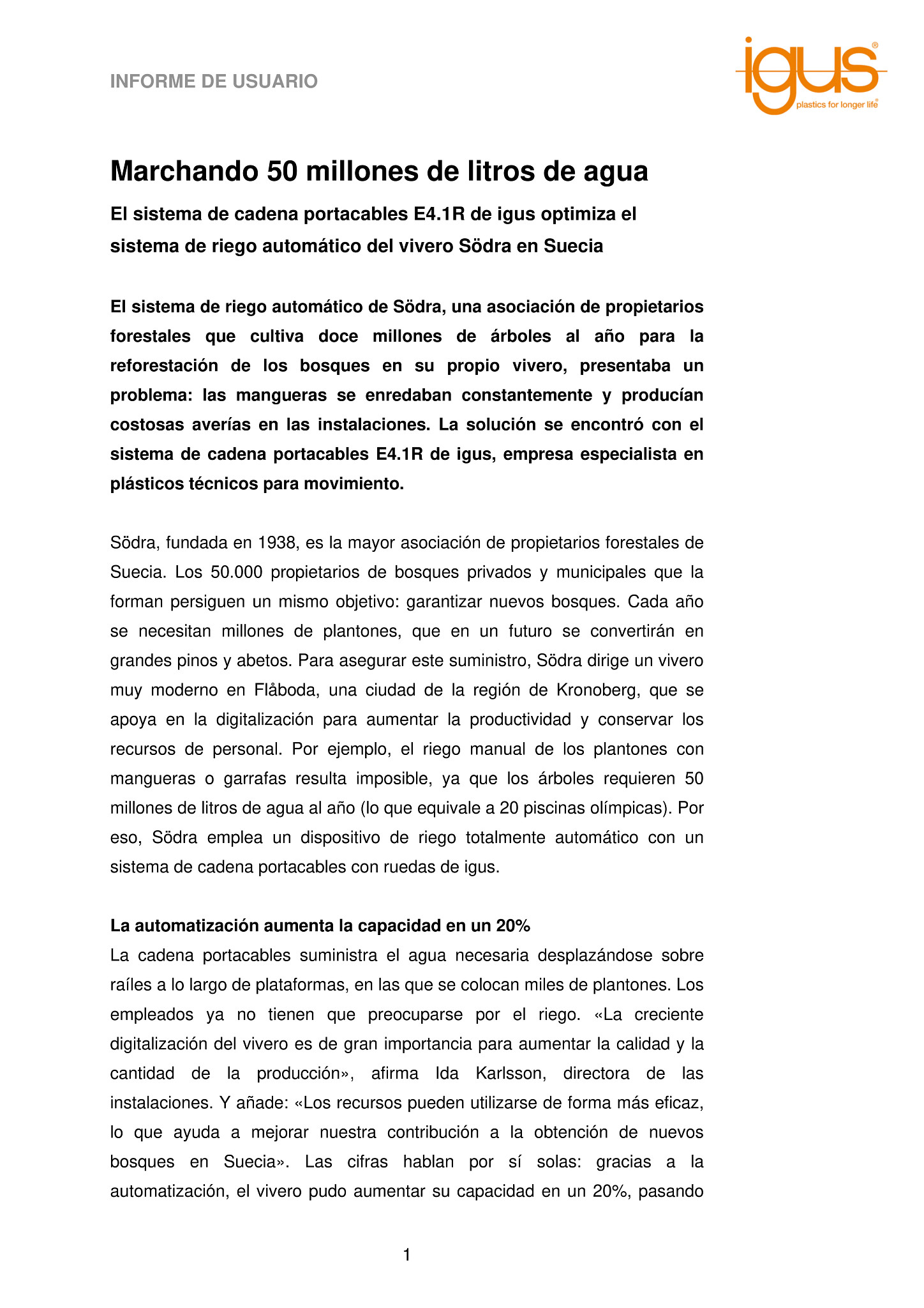 El sistema de riego automático de Södra, una asociación de propietarios forestales que cultiva doce millones de árboles al año para la reforestación de los bosques en su propio vivero, presentaba un problema: las mangueras se enredaban constantemente y producían costosas averías en las instalaciones. La solución se encontró con el sistema de cadena portacables E4.1R de igus, empresa especialista en plásticos técnicos para movimiento.