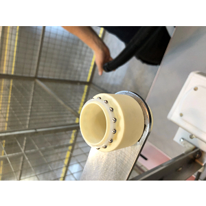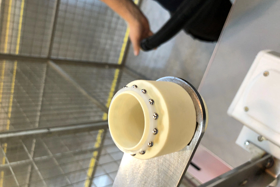 Después de semanas de desarrollo, comenzó la fase de prueba. En el interior de una celda de seguridad, el robot Epson Scara se movía a máxima velocidad. Al principio, todo parecía estar bien, pero a los pocos minutos, empezaron a surgir los problemas. «El enlace giratorio fabricado en 3D y el rodamiento de bolas no soportaron las cargas», explica Meyer. Y añade: «Para absorber las fuerzas axiales, se introdujeron dos rodamientos de bolas xiros estándar en la carcasa exterior, uno encima del otro. También hicimos que el diseño del enlace fuera aún más compacto y capaz de reducir las fuerzas de palanca. El principio de conexión de este diseño hace que sea posible hacerlo sin bridas».