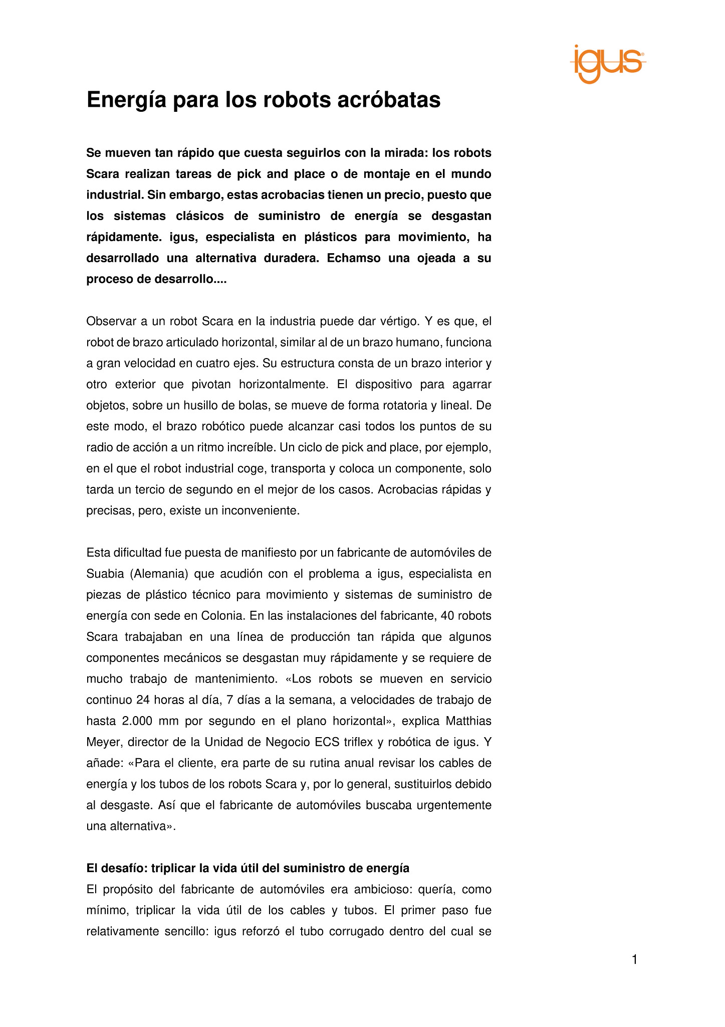 Se mueven tan rápido que cuesta seguirlos con la mirada: los robots Scara realizan tareas de pick and place o de montaje en el mundo industrial. Sin embargo, estas acrobacias tienen un precio, puesto que los sistemas clásicos de suministro de energía se desgastan rápidamente. igus, especialista en plásticos para movimiento, ha desarrollado una alternativa duradera. Echamso una ojeada a su proceso de desarrollo….