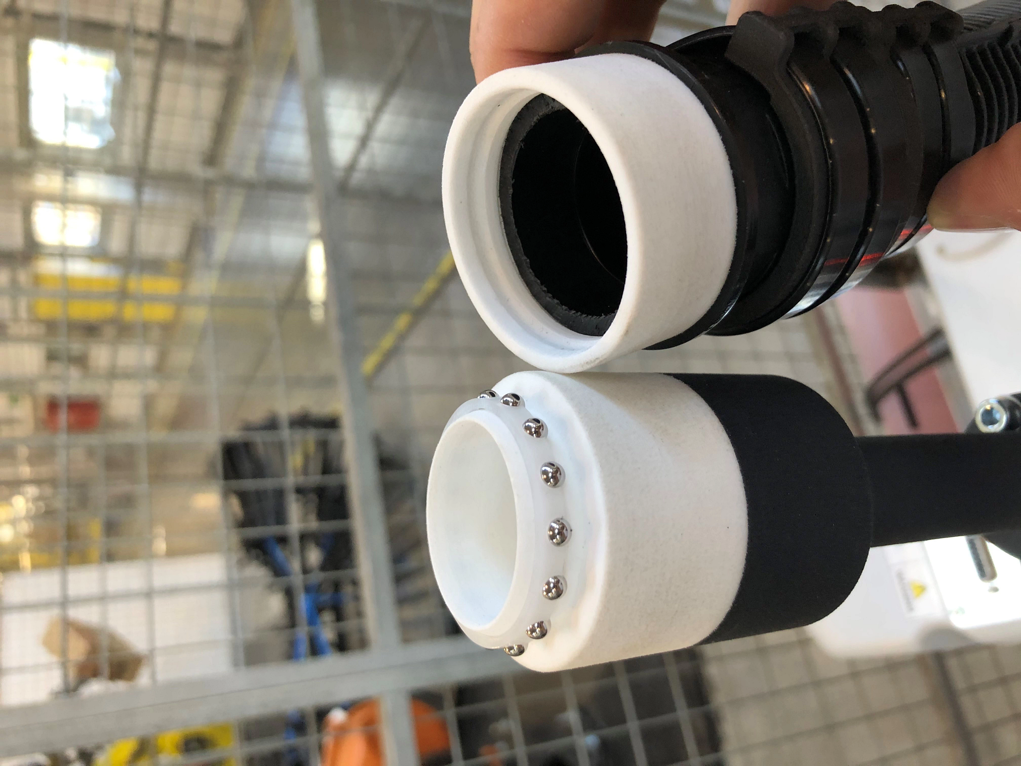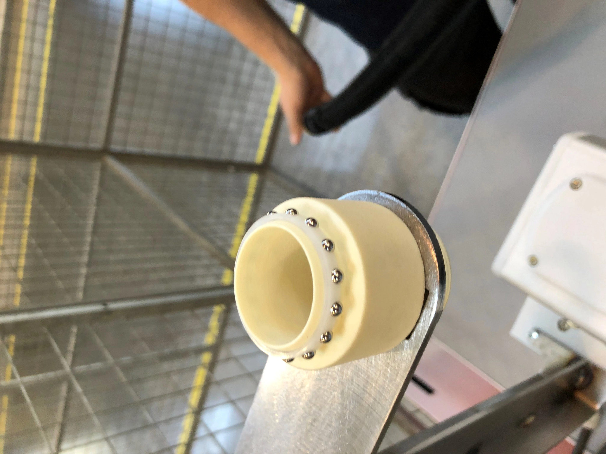 Después de semanas de desarrollo, comenzó la fase de prueba. En el interior de una celda de seguridad, el robot Epson Scara se movía a máxima velocidad. Al principio, todo parecía estar bien, pero a los pocos minutos, empezaron a surgir los problemas. «El enlace giratorio fabricado en 3D y el rodamiento de bolas no soportaron las cargas», explica Meyer. Y añade: «Para absorber las fuerzas axiales, se introdujeron dos rodamientos de bolas xiros estándar en la carcasa exterior, uno encima del otro. También hicimos que el diseño del enlace fuera aún más compacto y capaz de reducir las fuerzas de palanca. El principio de conexión de este diseño hace que sea posible hacerlo sin bridas».