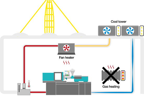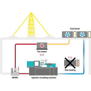 Las máquinas de inyección están equipadas con motores hidráulicos que se calientan durante el funcionamiento, por lo que, al igual que un coche, necesitan refrigeración para protegerse del sobrecalentamiento. Unas torres de refrigeración proporcionan agua fría y la conducen a las máquinas mediante un sistema de tuberías. A continuación, el agua caliente regresa a la torre de refrigeración y cuando se vuelve a enfriar, el calor escapa a la atmósfera y se pierde en forma de energía. Con el MHRS, parte del calor del circuito de refrigeración se capta mediante un control de flujo y se envía directamente a los calentadores, situados junto a los antiguos ventiladores de los calentadores de gas. Para evitar que estos se obstruyan de inmediato, los filtros separan las partículas en suspensión presentes en el agua. A continuación, el agua caliente se introduce en el nuevo calentador y hace que el antiguo deje de funcionar. Finalmente, un ventilador instalado en el calentador distribuye el aire caliente en la fábrica, el agua vuelve a la torre de refrigeración y el ciclo comienza de nuevo. Como no se utilizan intercambiadores de calor, el sistema también puede funcionar a bajas temperaturas.