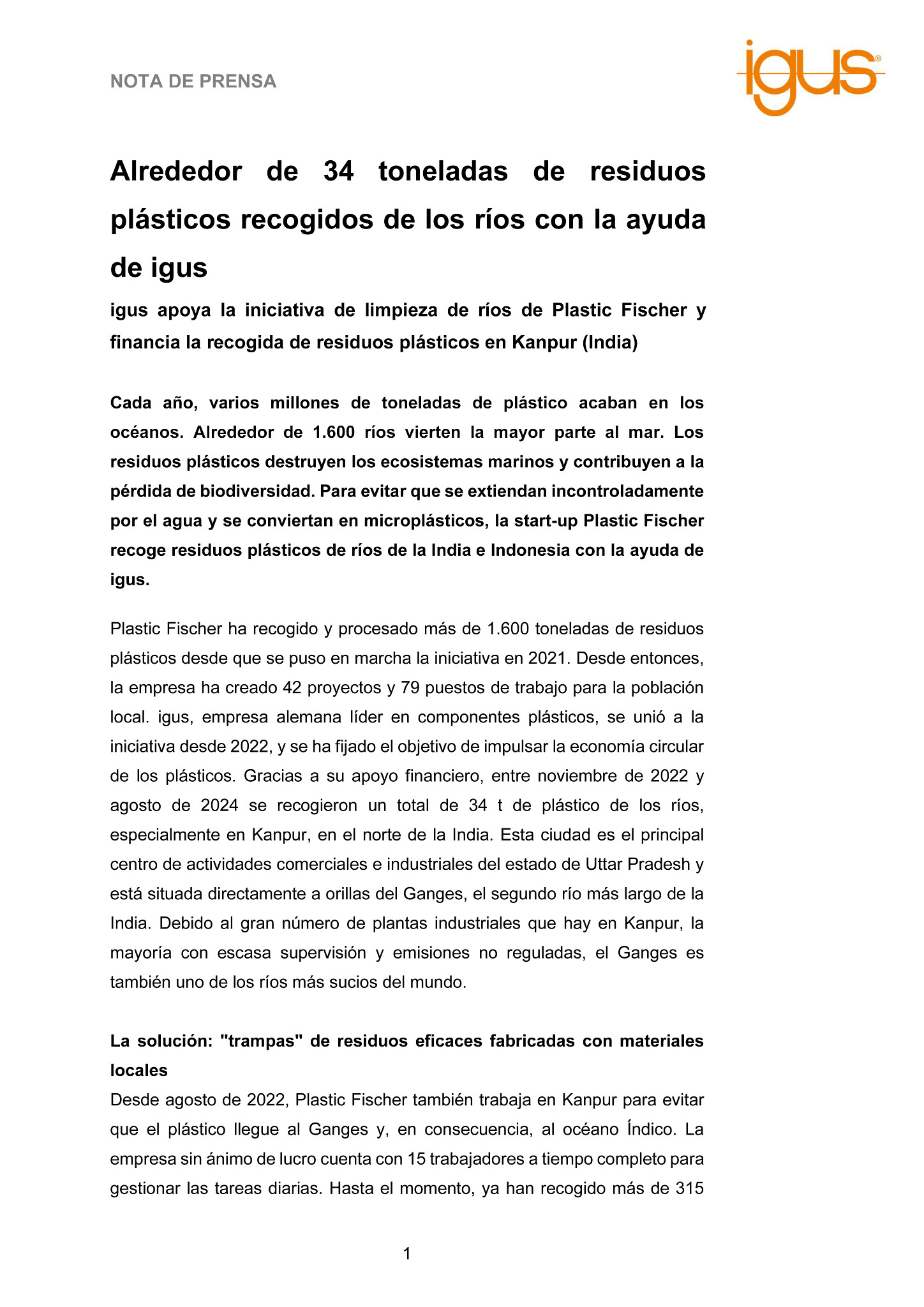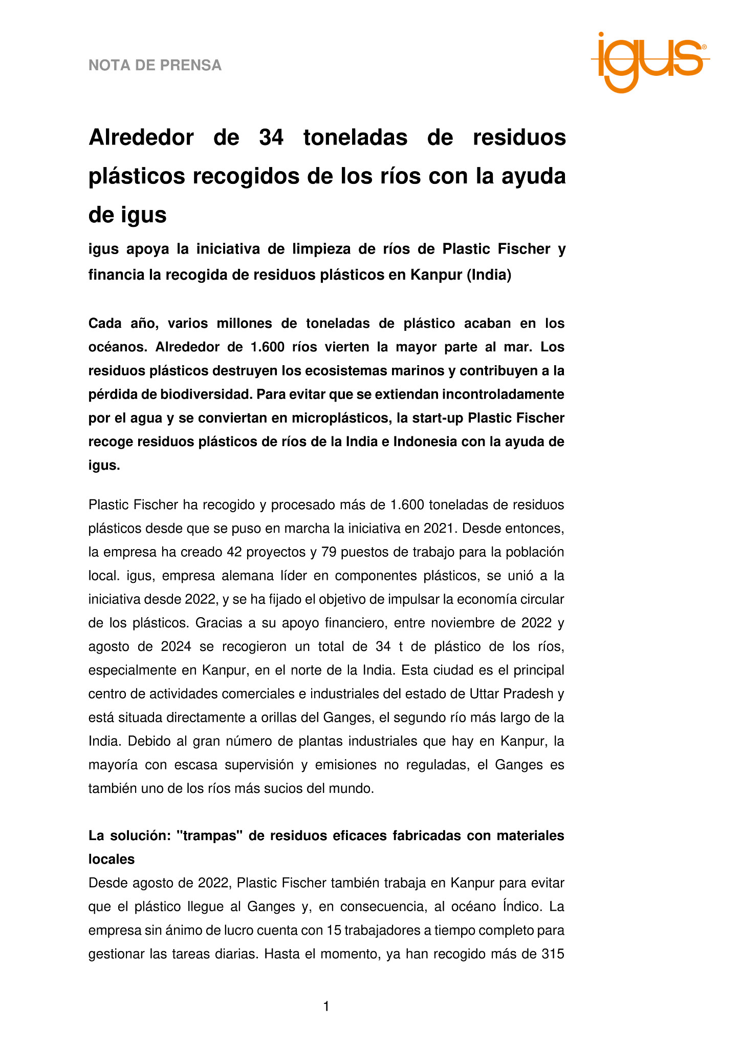 Plastic Fischer ha recogido y procesado más de 1.600 toneladas de residuos plásticos desde que se puso en marcha la iniciativa en 2021. Desde entonces, la empresa ha creado 42 proyectos y 79 puestos de trabajo para la población local. igus, empresa alemana líder en componentes plásticos, se unió a la iniciativa desde 2022, y se ha fijado el objetivo de impulsar la economía circular de los plásticos. Gracias a su apoyo financiero, entre noviembre de 2022 y agosto de 2024 se recogieron un total de 34 t de plástico de los ríos, especialmente en Kanpur, en el norte de la India. Esta ciudad es el principal centro de actividades comerciales e industriales del estado de Uttar Pradesh y está situada directamente a orillas del Ganges, el segundo río más largo de la India. Debido al gran número de plantas industriales que hay en Kanpur, la mayoría con escasa supervisión y emisiones no reguladas, el Ganges es también uno de los ríos más sucios del mundo.