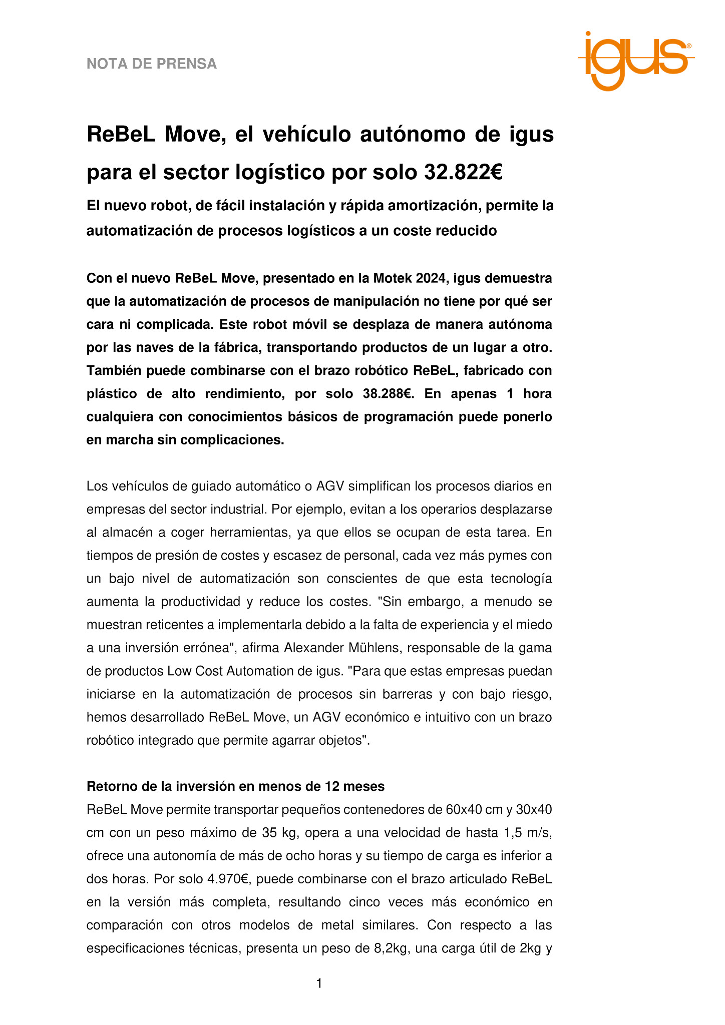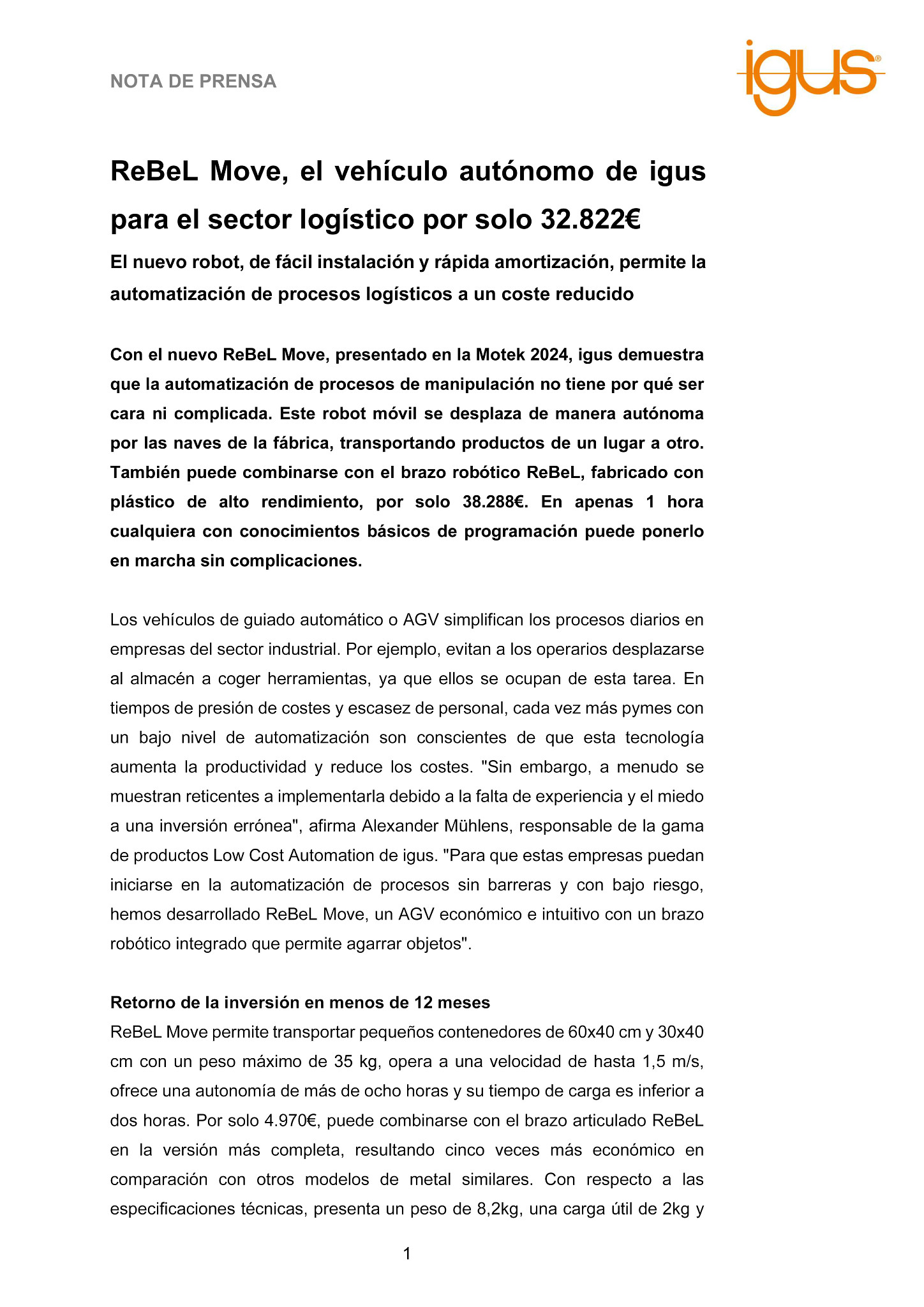 Con el nuevo ReBeL Move, presentado en la Motek 2024, igus demuestra que la automatización de procesos de manipulación no tiene por qué ser cara ni complicada. Este robot móvil se desplaza de manera autónoma por las naves de la fábrica, transportando productos de un lugar a otro. También puede combinarse con el brazo robótico ReBeL, fabricado con plástico de alto rendimiento, por solo 38.288€. En apenas 1 hora cualquiera con conocimientos básicos de programación puede ponerlo en marcha sin complicaciones.