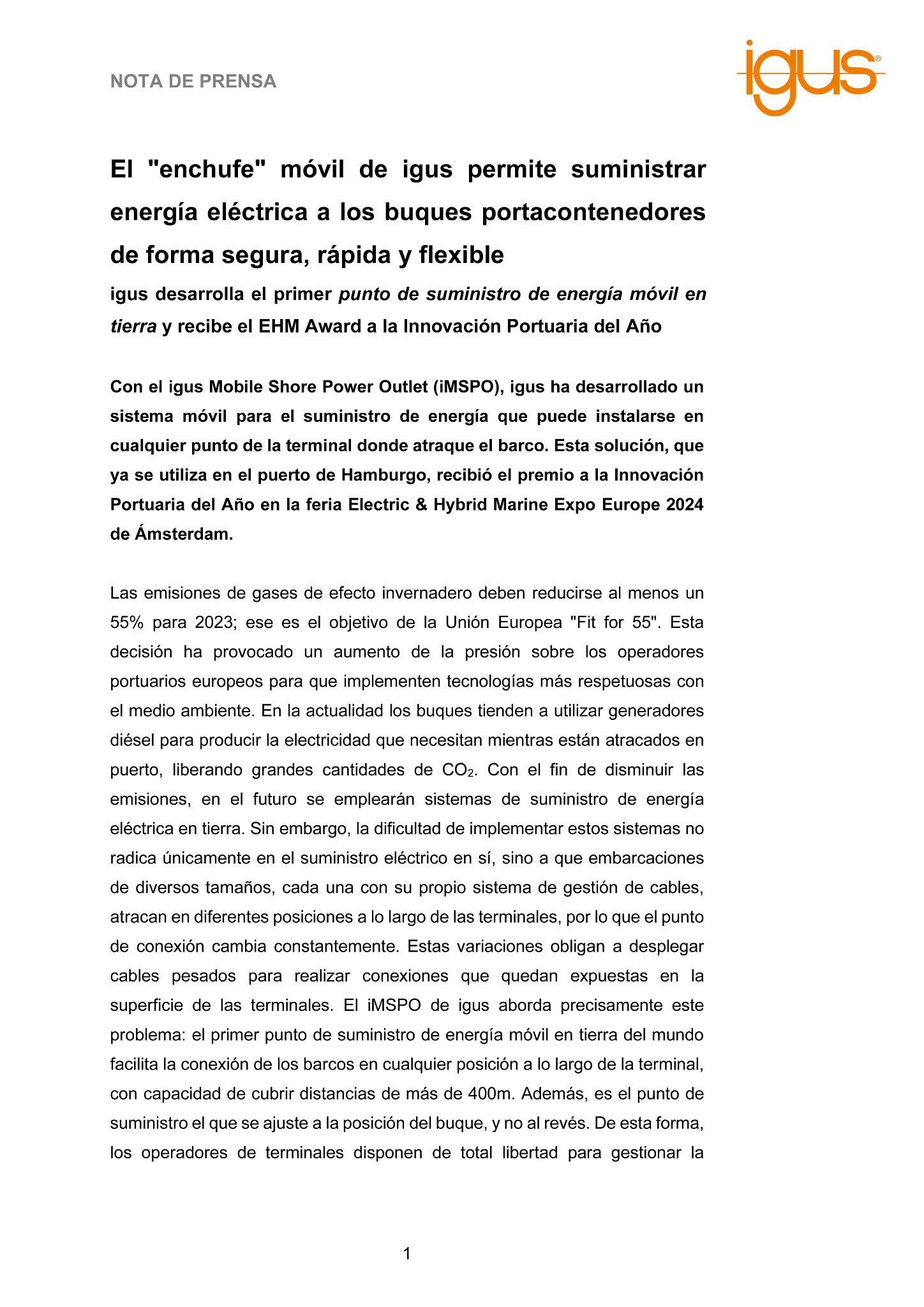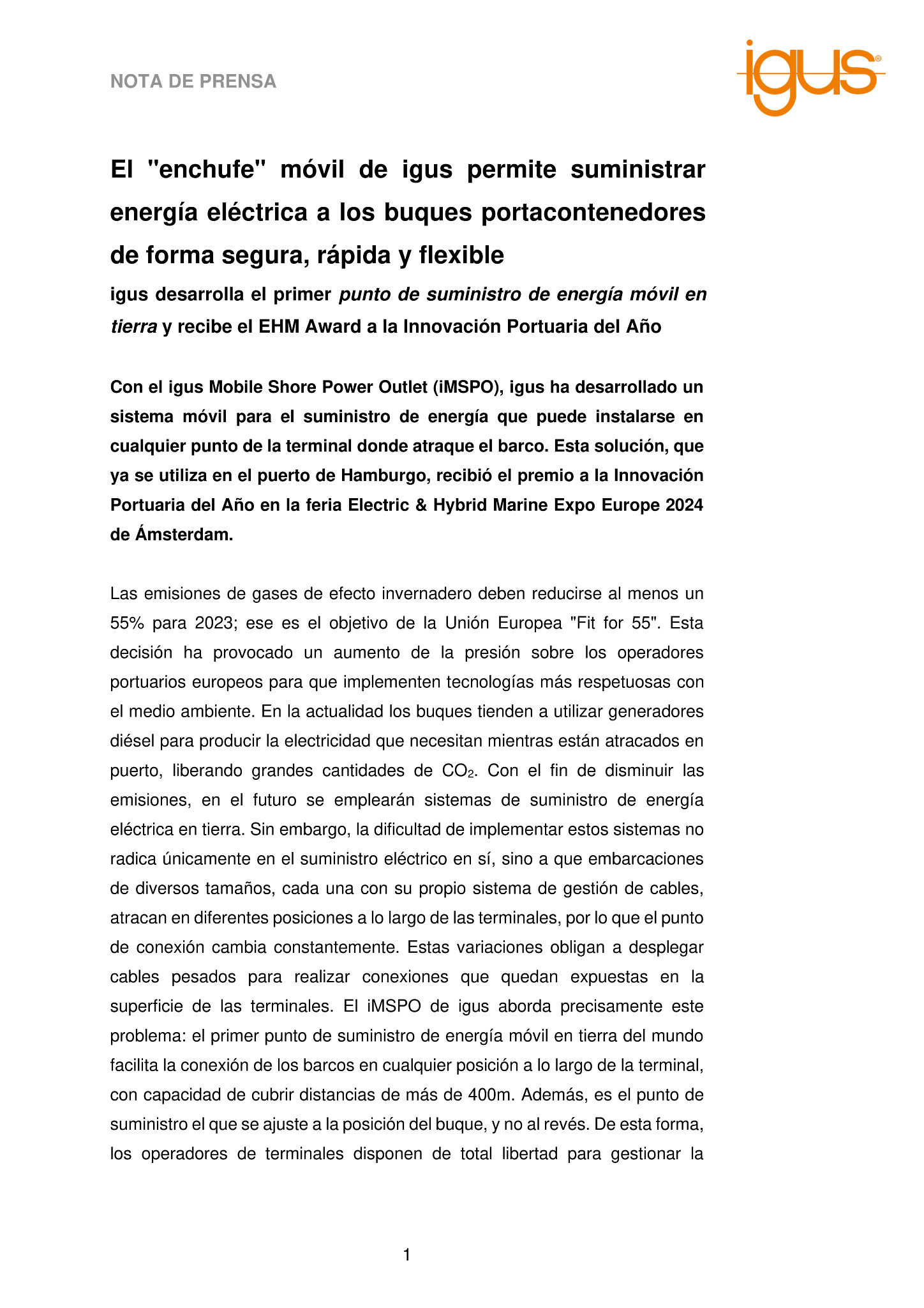 Con el igus Mobile Shore Power Outlet (iMSPO), igus ha desarrollado un sistema móvil para el suministro de energía que puede instalarse en cualquier punto de la terminal donde atraque el barco. Esta solución, que ya se utiliza en el puerto de Hamburgo, recibió el premio a la Innovación Portuaria del Año en la feria Electric & Hybrid Marine Expo Europe 2024 de Ámsterdam.