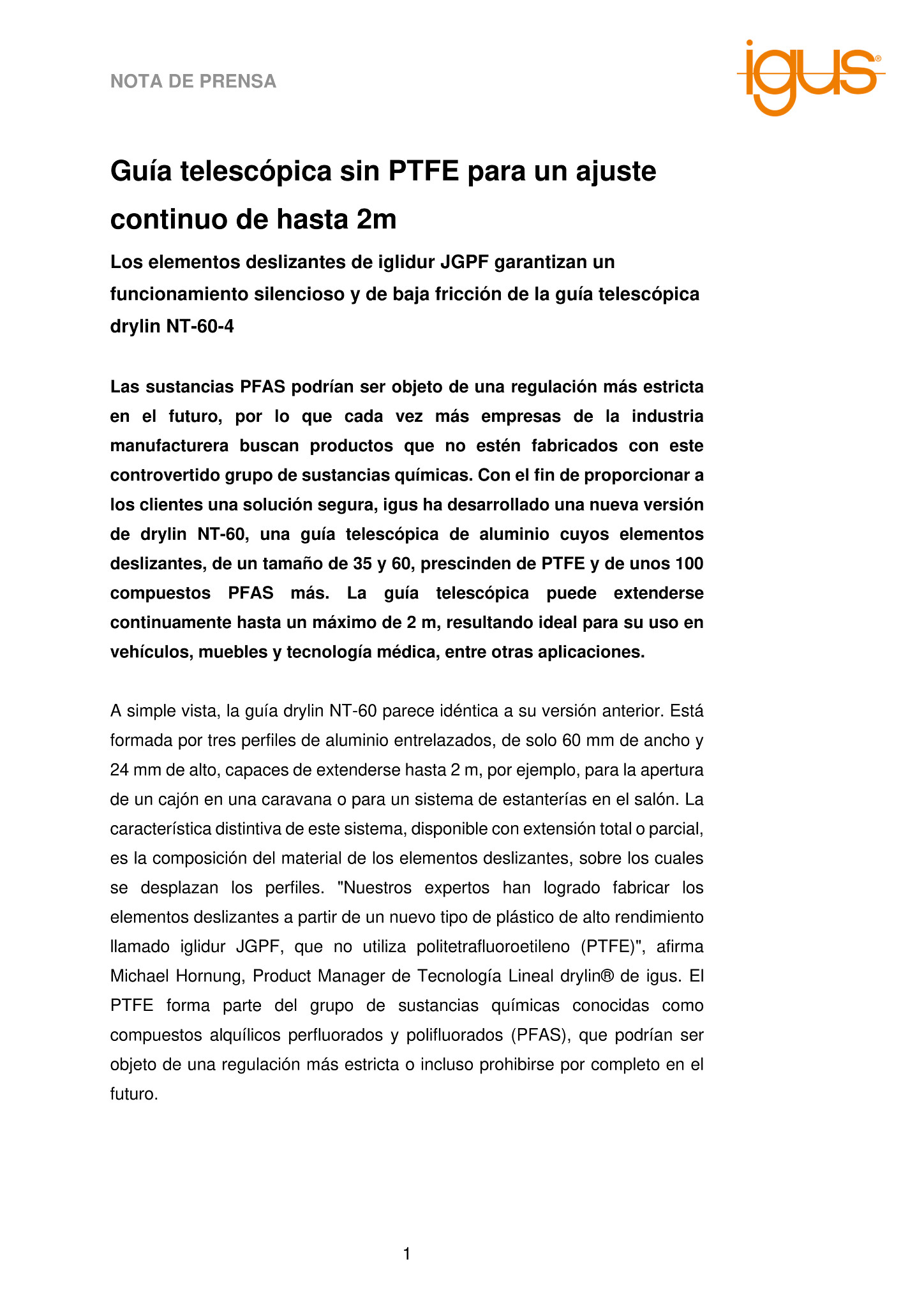 Las sustancias PFAS podrían ser objeto de una regulación más estricta en el futuro, por lo que cada vez más empresas de la industria manufacturera buscan productos que no estén fabricados con este controvertido grupo de sustancias químicas. Con el fin de proporcionar a los clientes una solución segura, igus ha desarrollado una nueva versión de drylin NT-60, una guía telescópica de aluminio cuyos elementos deslizantes, de un tamaño de 35 y 60, prescinden de PTFE y de unos 100 compuestos PFAS más. La guía telescópica puede extenderse continuamente hasta un máximo de 2 m, resultando ideal para su uso en vehículos, muebles y tecnología médica, entre otras aplicaciones.