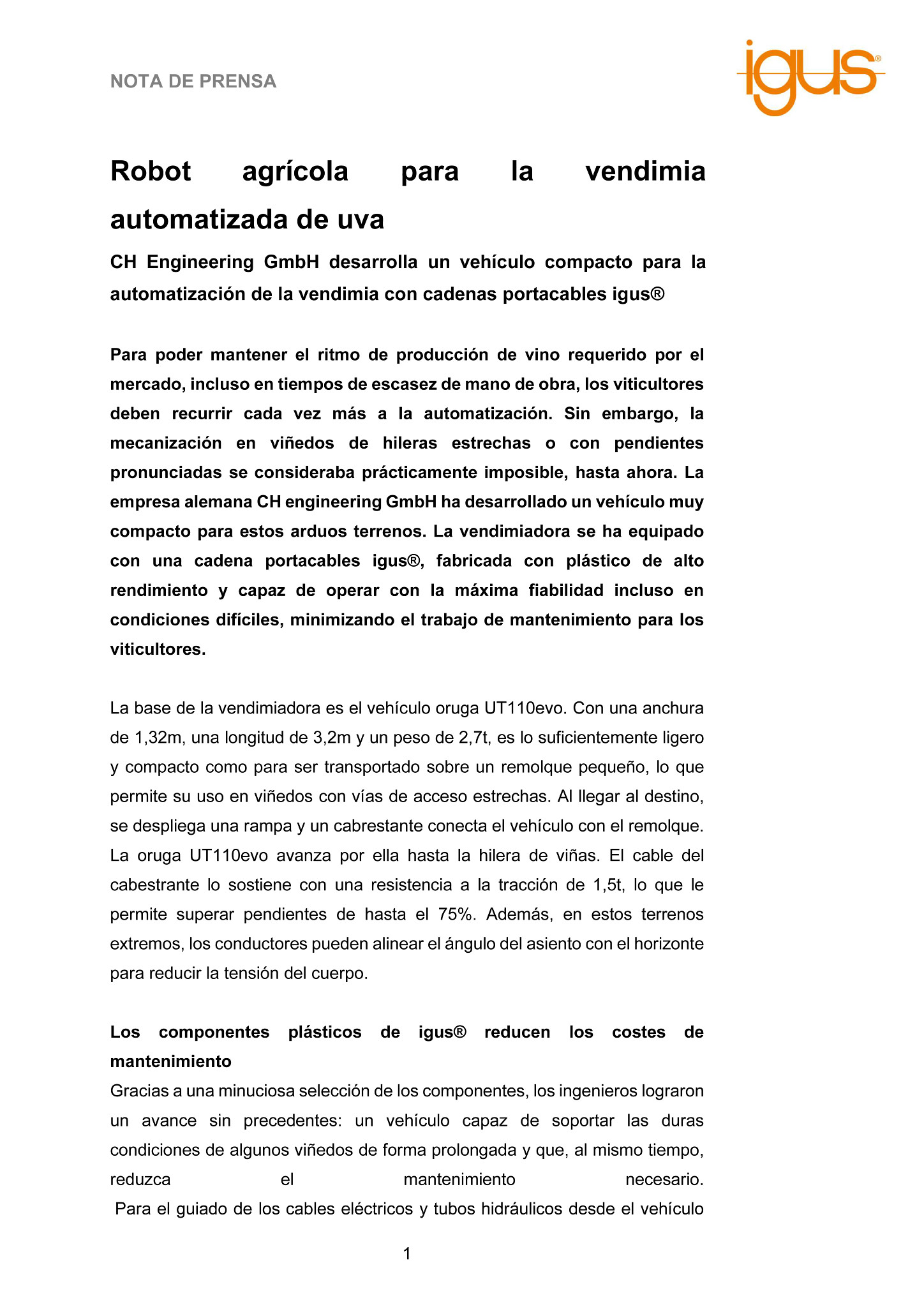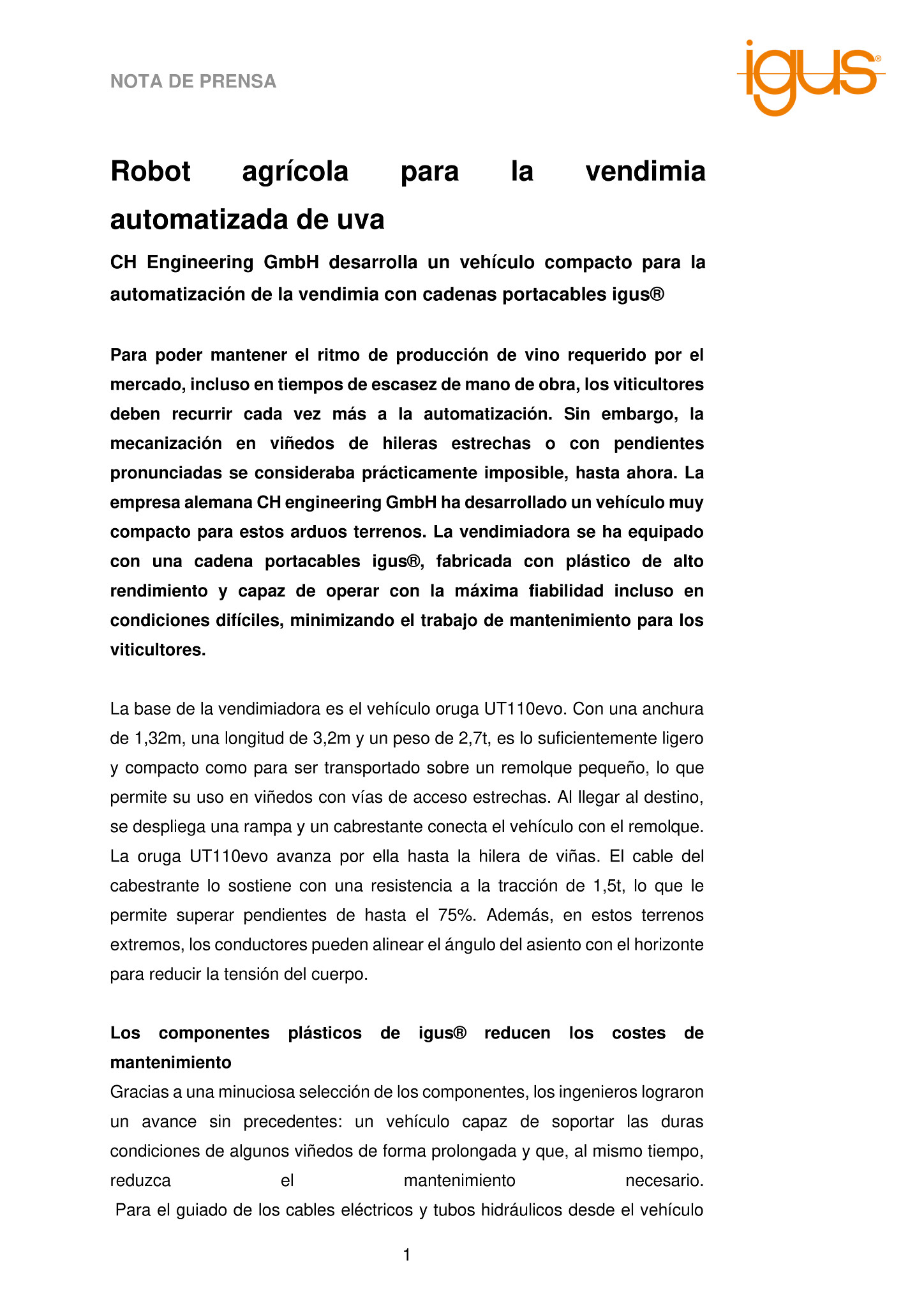 CH Engineering GmbH desarrolla un vehículo compacto para la automatización de la vendimia con cadenas portacables igus®