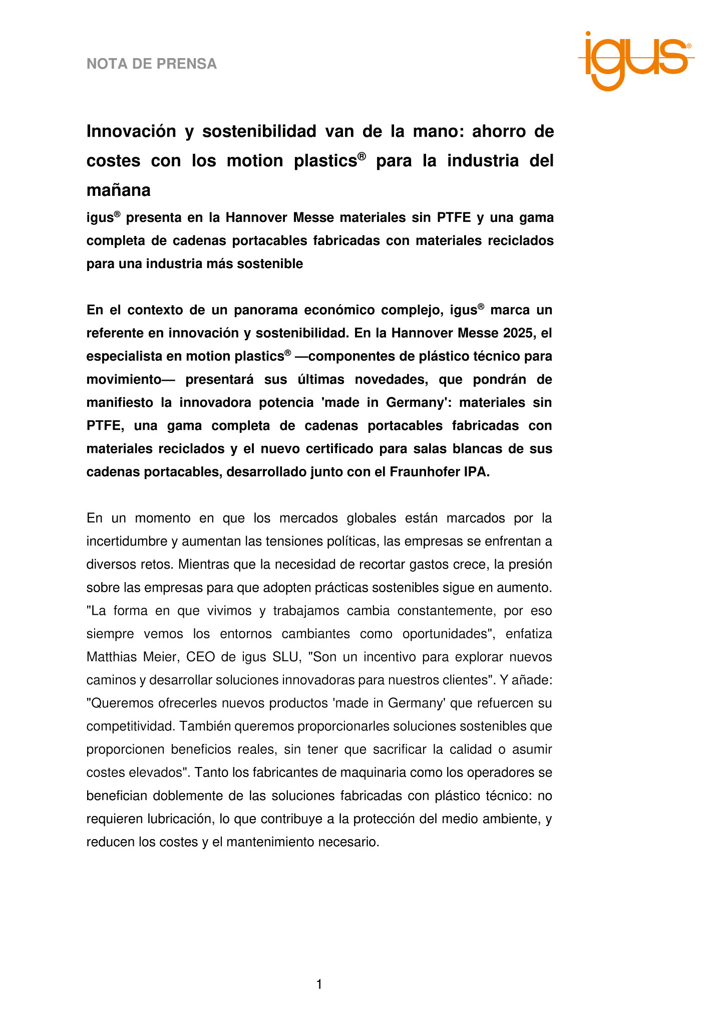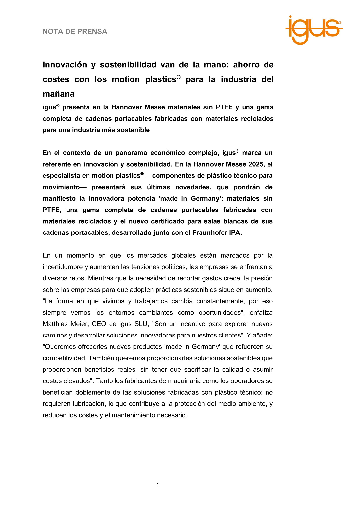 En el contexto de un panorama económico complejo, igus® marca un referente en innovación y sostenibilidad. En la Hannover Messe 2025, el especialista en motion plastics® —componentes de plástico técnico para movimiento— presentará sus últimas novedades, que pondrán de manifiesto la innovadora potencia ‘made in Germany’: materiales sin PTFE, una gama completa de cadenas portacables fabricadas con materiales reciclados y el nuevo certificado para salas blancas de sus cadenas portacables, desarrollado junto con el Fraunhofer IPA.
