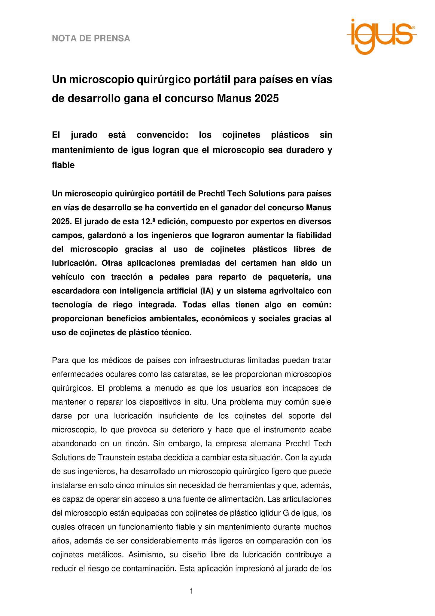 Para que los médicos de países con infraestructuras limitadas puedan tratar enfermedades oculares como las cataratas, se les proporcionan microscopios quirúrgicos. El problema a menudo es que los usuarios son incapaces de mantener o reparar los dispositivos in situ. Una problema muy común suele darse por una lubricación insuficiente de los cojinetes del soporte del microscopio, lo que provoca su deterioro y hace que el instrumento acabe abandonado en un rincón. Sin embargo, la empresa alemana Prechtl Tech Solutions de Traunstein estaba decidida a cambiar esta situación. Con la ayuda de sus ingenieros, ha desarrollado un microscopio quirúrgico ligero que puede instalarse en solo cinco minutos sin necesidad de herramientas y que, además, es capaz de operar sin acceso a una fuente de alimentación. Las articulaciones del microscopio están equipadas con cojinetes de plástico iglidur G de igus, los cuales ofrecen un funcionamiento fiable y sin mantenimiento durante muchos años, además de ser considerablemente más ligeros en comparación con los cojinetes metálicos. Asimismo, su diseño libre de lubricación contribuye a reducir el riesgo de contaminación. Esta aplicación impresionó al jurado de los Premios Manus 2025 —compuesto por profesionales de la prensa especializada, la industria, la investigación y los negocios—, que entregó a Prechtl Tech Solutions el premio Manus de Oro con sus correspondientes 5.000 euros en metálico. Los expertos elogiaron el enfoque creativo, además del diseño sencillo y económico con un alto beneficio social.