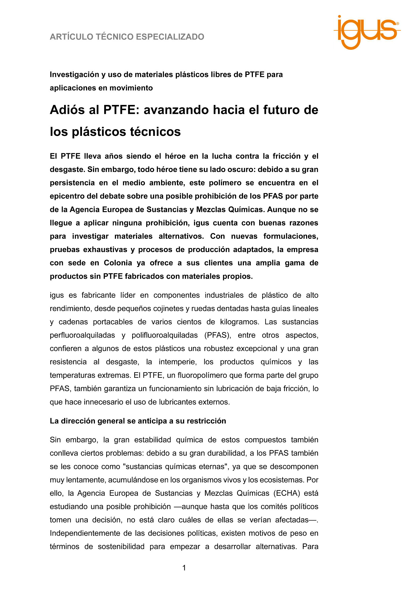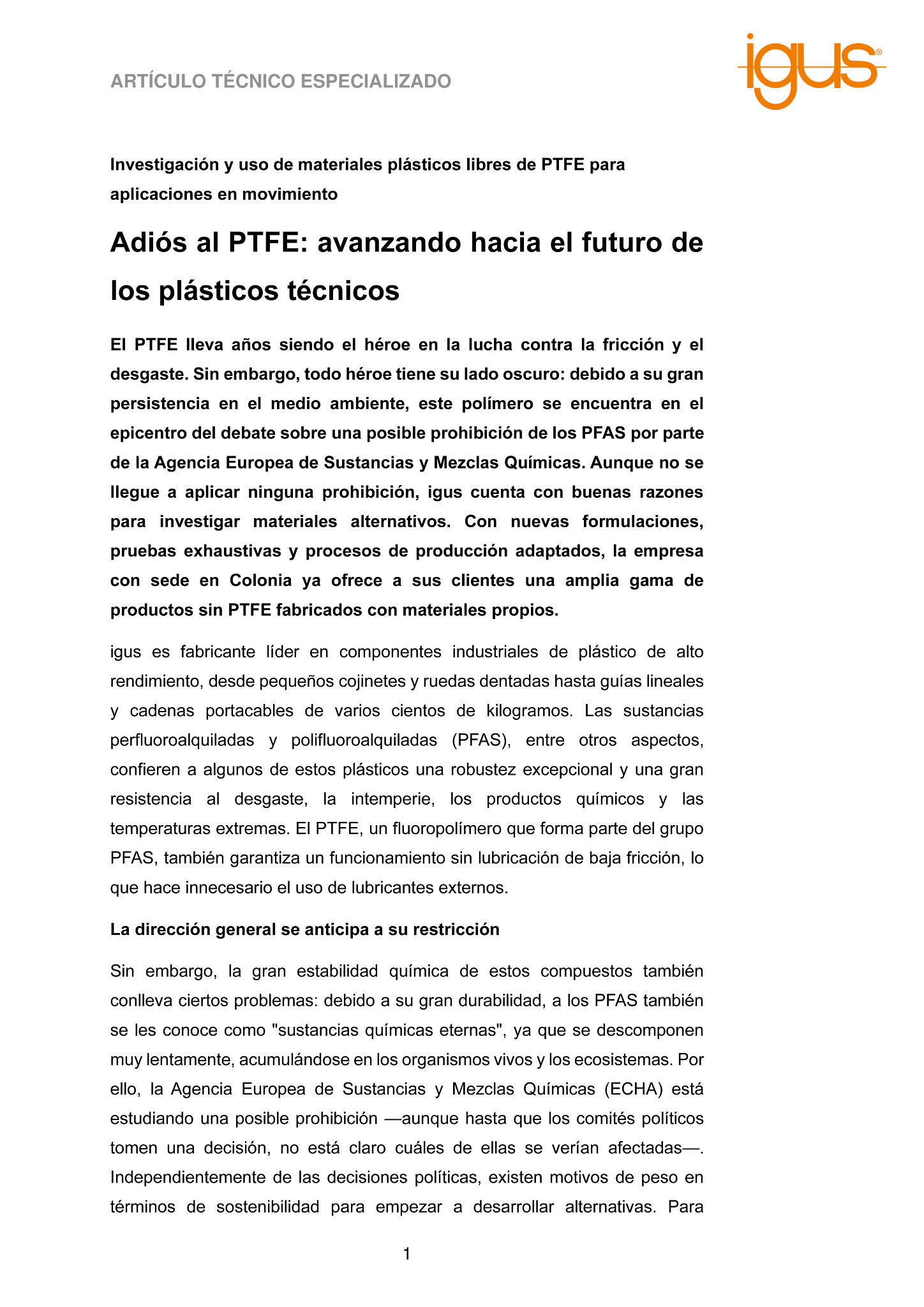 Aunque persiste la incertidumbre sobre la prohibición de los PFAS, de lo que no cabe duda es que igus ofrece una amplia gama de productos libres de estas sustancias químicas consideradas nocivas para el medio ambiente. Gracias a su espíritu innovador y su fuerte compromiso con la sostenibilidad, la empresa alemana está allanando el camino hacia un futuro sin imprevistos y respetuoso con el medio ambiente para los plásticos técnicos de alto rendimiento.