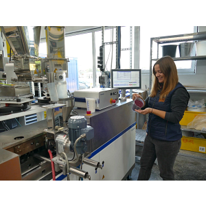 Imagen 1: La experta en plásticos técnicos Lena Arnold desarrolla y prueba nuevas versiones de formulación en la extrusora.