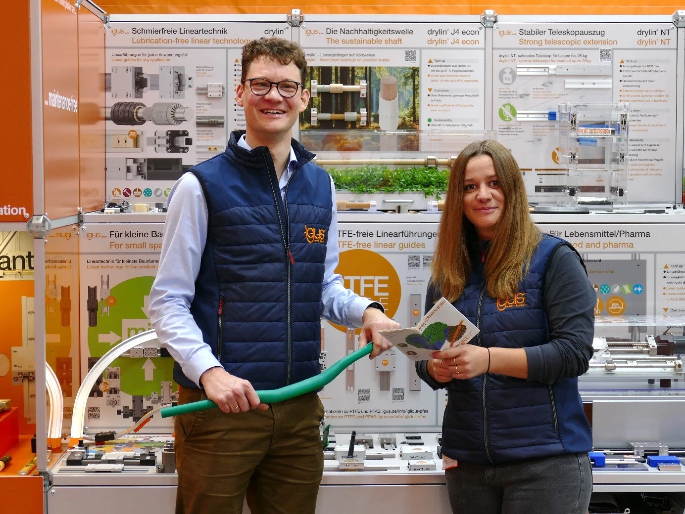 Actualmente, más del 75% de los productos de igus pueden ofrecerse sin PTFE. Los expertos en desarrollo de materiales están trabajando en otras alternativas, especialmente enfocadas a plásticos altamente reforzados. La empresa presentó algunos de sus nuevos productos sin PTFE en la feria Hannover Messe de 2025.