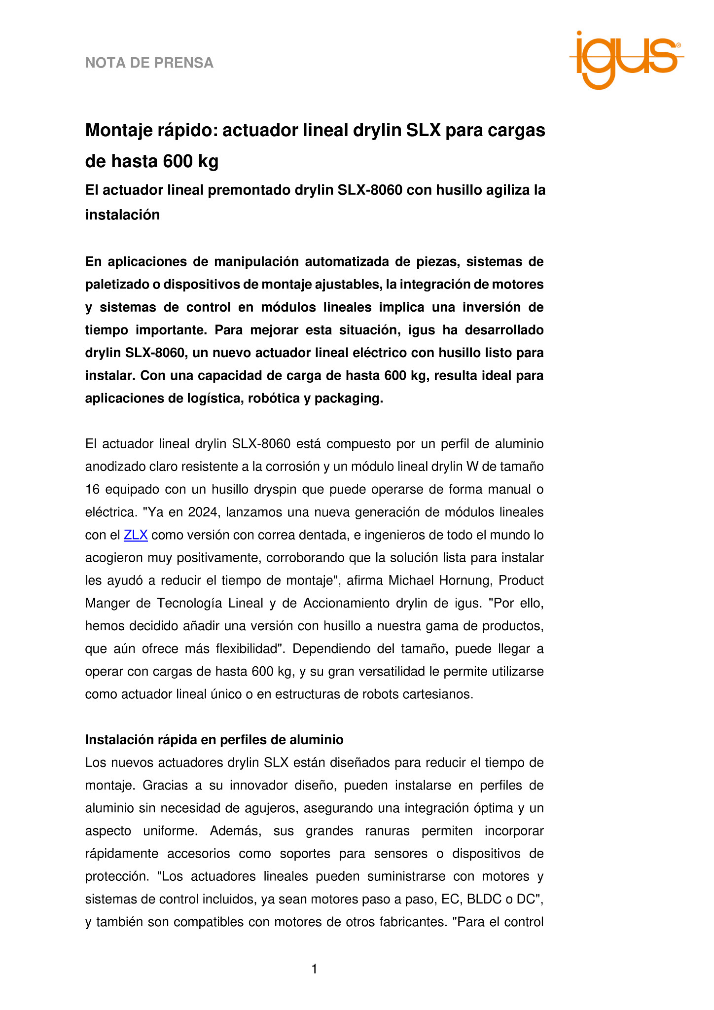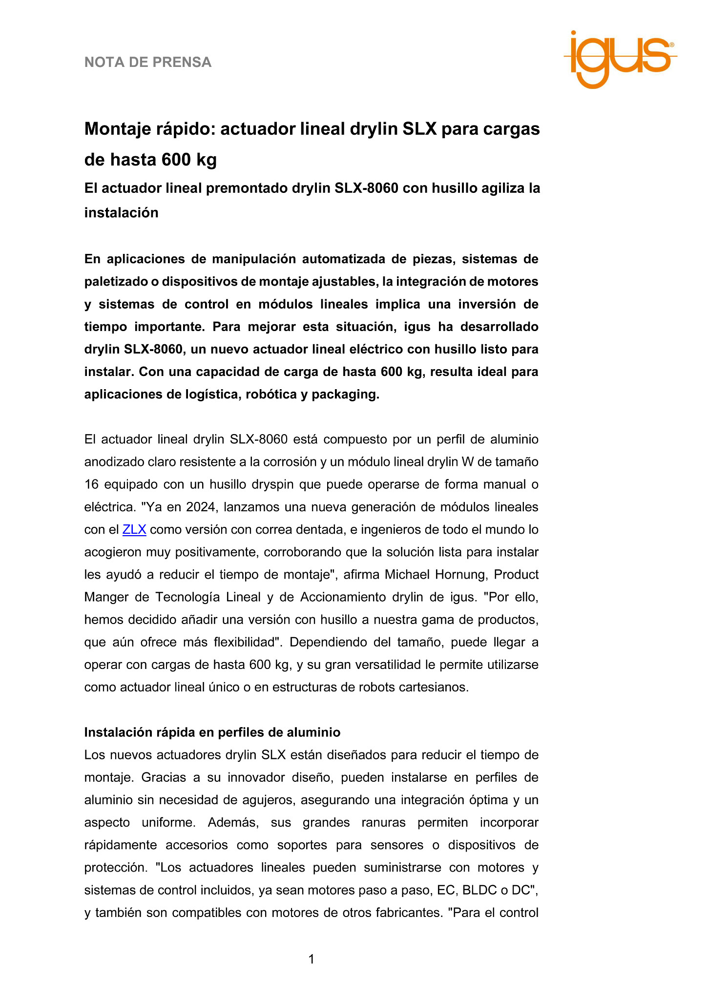 El actuador lineal drylin SLX-8060 está compuesto por un perfil de aluminio anodizado claro resistente a la corrosión y un módulo lineal drylin W de tamaño 16 equipado con un husillo dryspin que puede operarse de forma manual o eléctrica. «Ya en 2024, lanzamos una nueva generación de módulos lineales con el ZLX como versión con correa dentada, e ingenieros de todo el mundo lo acogieron muy positivamente, corroborando que la solución lista para instalar les ayudó a reducir el tiempo de montaje», afirma Michael Hornung, Product Manger de Tecnología Lineal y de Accionamiento drylin de igus. «Por ello, hemos decidido añadir una versión con husillo a nuestra gama de productos, que aún ofrece más flexibilidad». Dependiendo del tamaño, puede llegar a operar con cargas de hasta 600 kg, y su gran versatilidad le permite utilizarse como actuador lineal único o en estructuras de robots cartesianos.