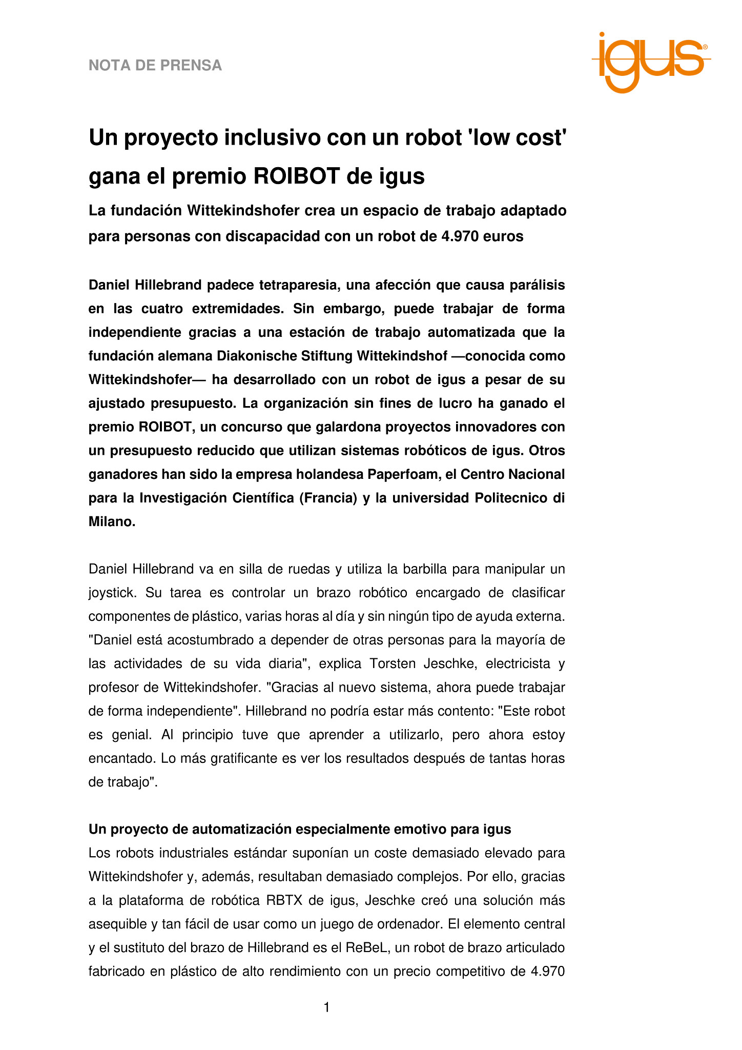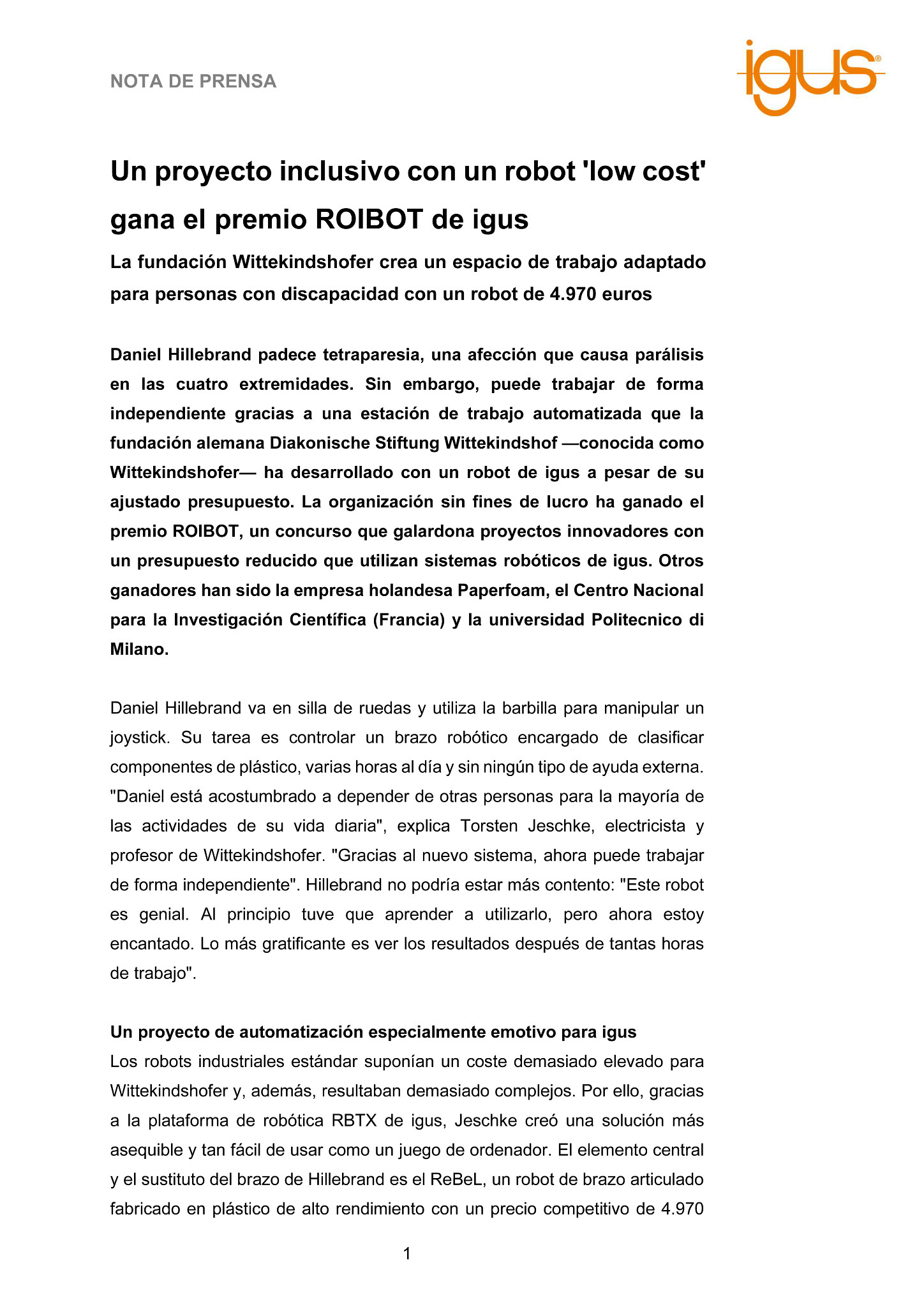 Daniel Hillebrand padece tetraparesia, una afección que causa parálisis en las cuatro extremidades. Sin embargo, puede trabajar de forma independiente gracias a una estación de trabajo automatizada que la fundación alemana Diakonische Stiftung Wittekindshof —conocida como Wittekindshofer— ha desarrollado con un robot de igus a pesar de su ajustado presupuesto. La organización sin fines de lucro ha ganado el premio ROIBOT, un concurso que galardona proyectos innovadores con un presupuesto reducido que utilizan sistemas robóticos de igus. Otros ganadores han sido la empresa holandesa Paperfoam, el Centro Nacional para la Investigación Científica (Francia) y la universidad Politecnico di Milano.