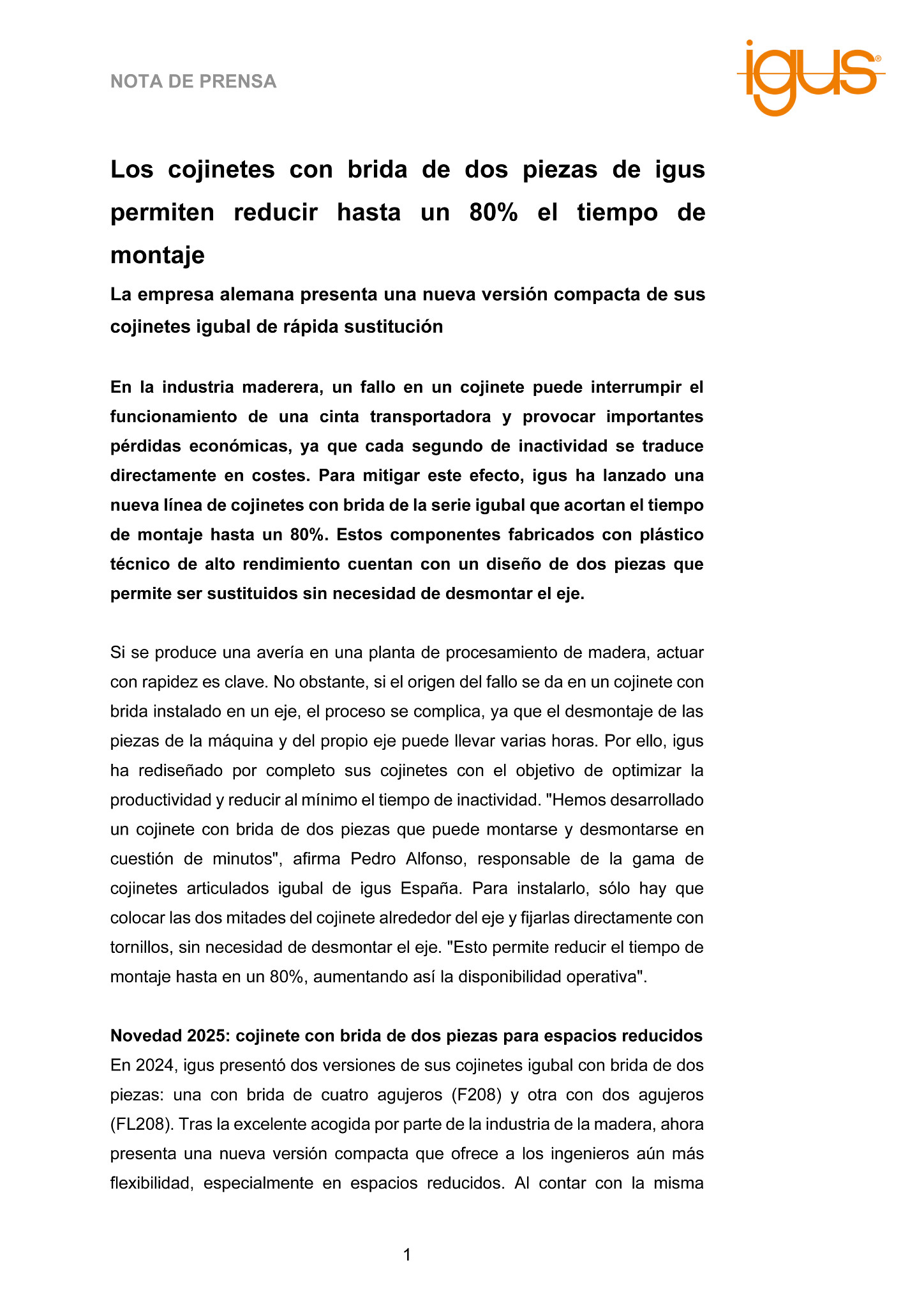 En la industria maderera, un fallo en un cojinete puede interrumpir el funcionamiento de una cinta transportadora y provocar importantes pérdidas económicas, ya que cada segundo de inactividad se traduce directamente en costes. Para mitigar este efecto, igus ha lanzado una nueva línea de cojinetes con brida de la serie igubal que acortan el tiempo de montaje hasta un 80%. Estos componentes fabricados con plástico técnico de alto rendimiento cuentan con un diseño de dos piezas que permite ser sustituidos sin necesidad de desmontar el eje.