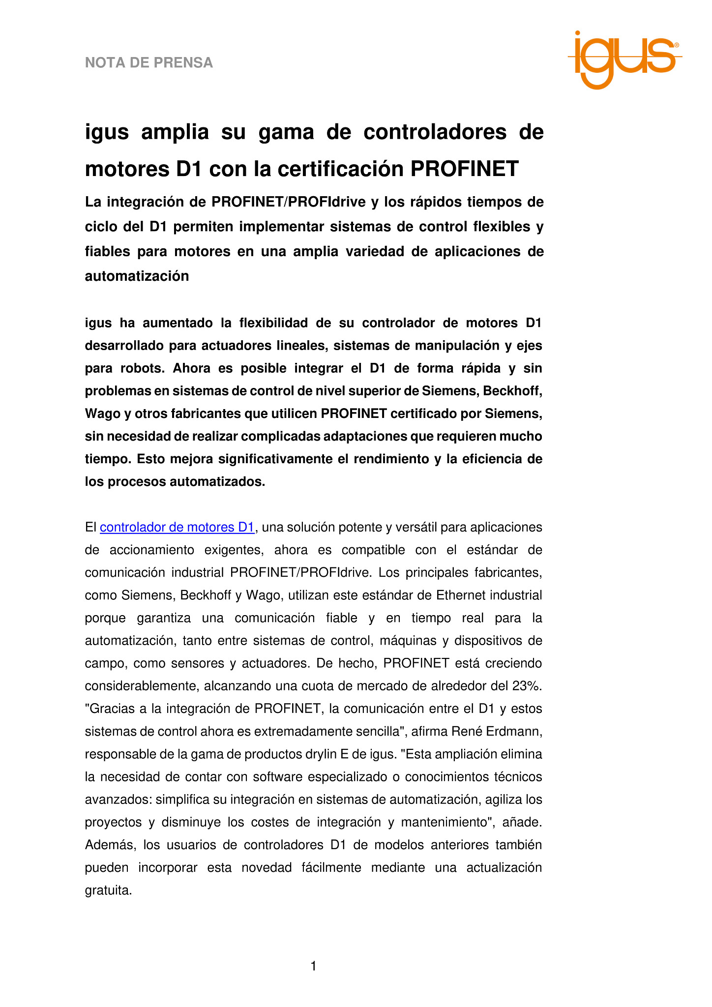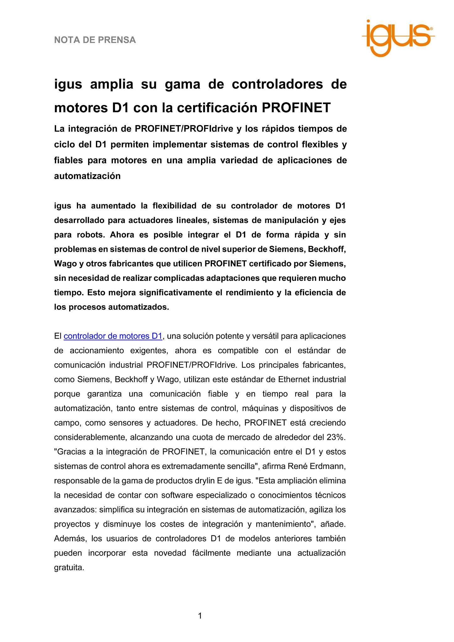 El controlador de motores D1, una solución potente y versátil para aplicaciones de accionamiento exigentes, ahora es compatible con el estándar de comunicación industrial PROFINET/PROFIdrive. Los principales fabricantes, como Siemens, Beckhoff y Wago, utilizan este estándar de Ethernet industrial porque garantiza una comunicación fiable y en tiempo real para la automatización, tanto entre sistemas de control, máquinas y dispositivos de campo, como sensores y actuadores. De hecho, PROFINET está creciendo considerablemente, alcanzando una cuota de mercado de alrededor del 23%. «Gracias a la integración de PROFINET, la comunicación entre el D1 y estos sistemas de control ahora es extremadamente sencilla», afirma René Erdmann, responsable de la gama de productos drylin E de igus. «Esta ampliación elimina la necesidad de contar con software especializado o conocimientos técnicos avanzados: simplifica su integración en sistemas de automatización, agiliza los proyectos y disminuye los costes de integración y mantenimiento», añade. Además, los usuarios de controladores D1 de modelos anteriores también pueden incorporar esta novedad fácilmente mediante una actualización gratuita.