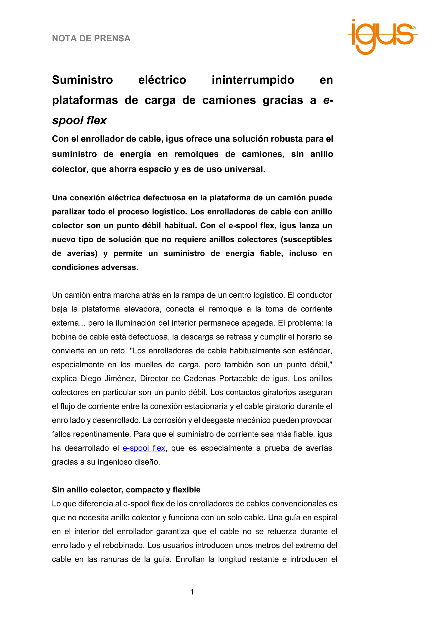 Un camión entra marcha atrás en la rampa de un centro logístico. El conductor baja la plataforma elevadora, conecta el remolque a la toma de corriente externa… pero la iluminación del interior permanece apagada. El problema: la bobina de cable está defectuosa, la descarga se retrasa y cumplir el horario se convierte en un reto. «Los enrolladores de cable habitualmente son estándar, especialmente en los muelles de carga, pero también son un punto débil,» explica Diego Jiménez, Director de Cadenas Portacable de igus. Los anillos colectores en particular son un punto débil. Los contactos giratorios aseguran el flujo de corriente entre la conexión estacionaria y el cable giratorio durante el enrollado y desenrollado. La corrosión y el desgaste mecánico pueden provocar fallos repentinamente. Para que el suministro de corriente sea más fiable, igus ha desarrollado el e-spool flex, que es especialmente a prueba de averías gracias a su ingenioso diseño.