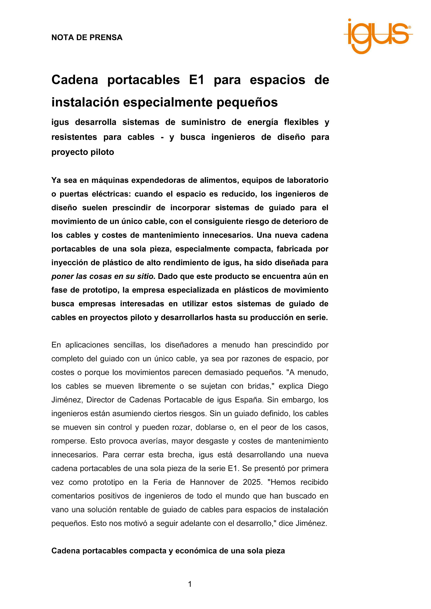 En aplicaciones sencillas, los diseñadores a menudo han prescindido por completo del guiado con un único cable, ya sea por razones de espacio, por costes o porque los movimientos parecen demasiado pequeños. «A menudo, los cables se mueven libremente o se sujetan con bridas,» explica Diego Jiménez, Director de Cadenas Portacable de igus España. Sin embargo, los ingenieros están asumiendo ciertos riesgos. Sin un guiado definido, los cables se mueven sin control y pueden rozar, doblarse o, en el peor de los casos, romperse. Esto provoca averías, mayor desgaste y costes de mantenimiento innecesarios. Para cerrar esta brecha, igus está desarrollando una nueva cadena portacables de una sola pieza de la serie E1. Se presentó por primera vez como prototipo en la Feria de Hannover de 2025. «Hemos recibido comentarios positivos de ingenieros de todo el mundo que han buscado en vano una solución rentable de guiado de cables para espacios de instalación pequeños. Esto nos motivó a seguir adelante con el desarrollo,» dice Jiménez.