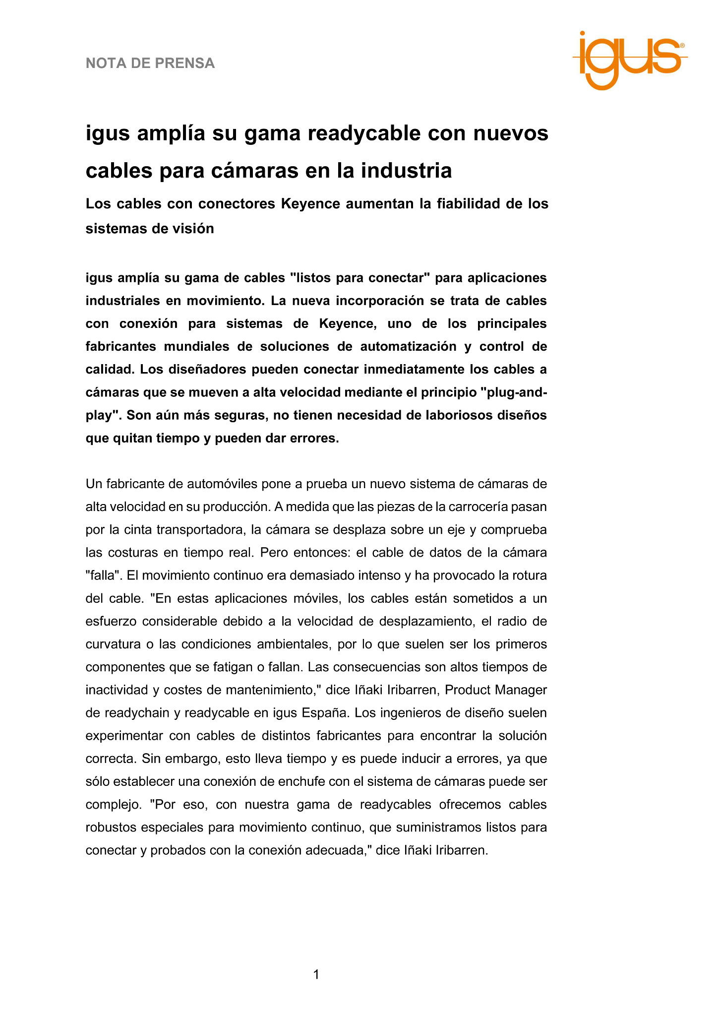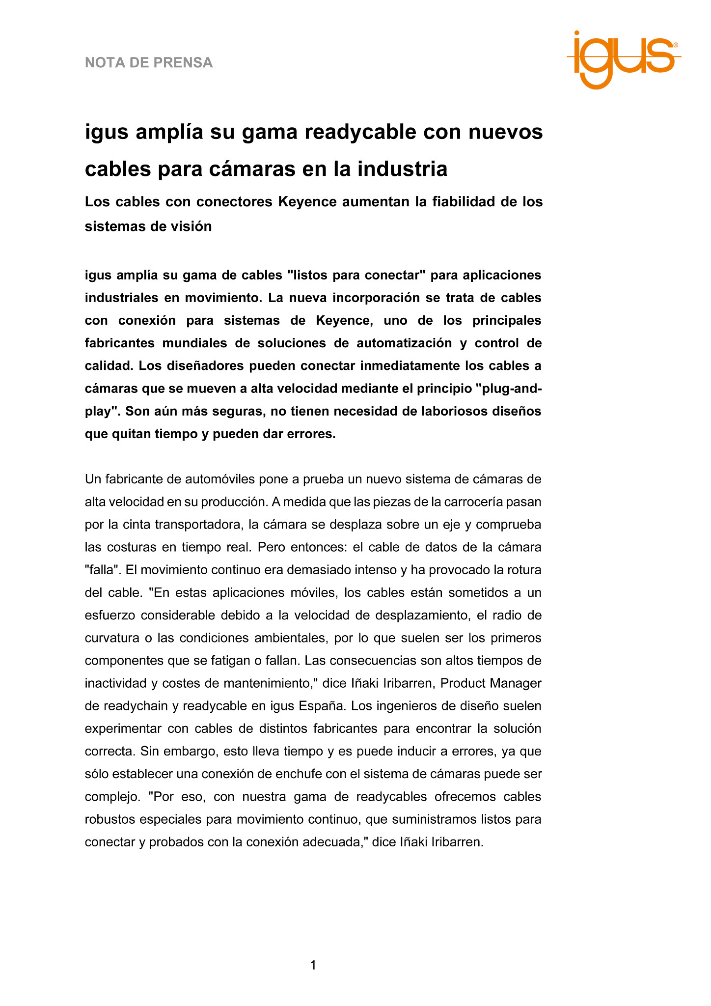 Un fabricante de automóviles pone a prueba un nuevo sistema de cámaras de alta velocidad en su producción. A medida que las piezas de la carrocería pasan por la cinta transportadora, la cámara se desplaza sobre un eje y comprueba las costuras en tiempo real. Pero entonces: el cable de datos de la cámara «falla». El movimiento continuo era demasiado intenso y ha provocado la rotura del cable. «En estas aplicaciones móviles, los cables están sometidos a un esfuerzo considerable debido a la velocidad de desplazamiento, el radio de curvatura o las condiciones ambientales, por lo que suelen ser los primeros componentes que se fatigan o fallan. Las consecuencias son altos tiempos de inactividad y costes de mantenimiento,» dice Iñaki Iribarren, Product Manager de readychain y readycable en igus España. Los ingenieros de diseño suelen experimentar con cables de distintos fabricantes para encontrar la solución correcta. Sin embargo, esto lleva tiempo y es puede inducir a errores, ya que sólo establecer una conexión de enchufe con el sistema de cámaras puede ser complejo. «Por eso, con nuestra gama de readycables ofrecemos cables robustos especiales para movimiento continuo, que suministramos listos para conectar y probados con la conexión adecuada,» dice Iñaki Iribarren.