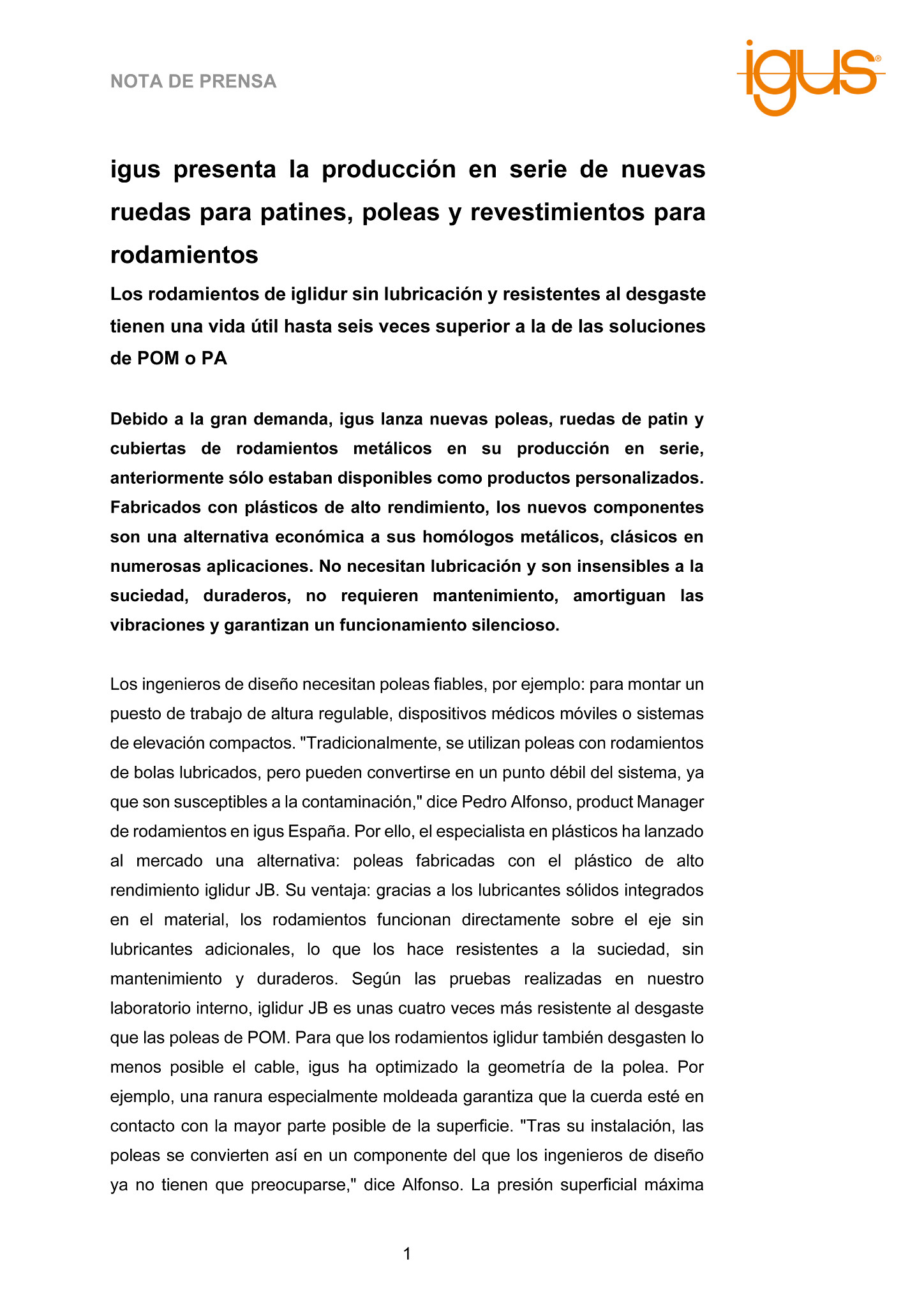 Otro nuevo producto de la gama igus son las ruedas de patines fabricadas con el plástico de alto rendimiento iglidur J. Son adecuados para ajustes lineales, por ejemplo para el cierre de puertas de máquinas, en paneles de control móviles o cajas de protección compactas. Hasta ahora, en estos casos se solían utilizar rodillos metálicos con rodamientos de bolas que tenían que ser lubricados. «Los rodamientos metálicos son muy pesados, por lo que requieren una mayor fuerza de accionamiento cuando el eje está en movimiento. Además, son sensibles a la suciedad, son propensos a la corrosión en determinadas circunstancias y pueden provocar daños en los raíles de rodadura cuando están sometidos a una carga continua,» explica Alfonso. Por otro lado, las nuevas ruedas de patines fabricadas con el material tribológicamente optimizado y libre de lubricación iglidur J, son resistentes a la suciedad, libres de corrosión, suaves con los raíles – y adecuadas para presiones superficiales de hasta 10MPa. Según pruebas de laboratorio, también son unas seis veces más resistentes al desgaste que las ruedas de patín fabricadas con POM. Aunque hasta ahora las ruedas de patín sólo estaban disponibles como piezas especiales, igus las lanza ahora como componentes producidos en serie debido a la creciente demanda. Actualmente están disponibles con diámetros exteriores de 19 a 40 mm y pueden sustituirse uno a uno por rodamientos de bolas estándar sin ningún cambio en el diseño.