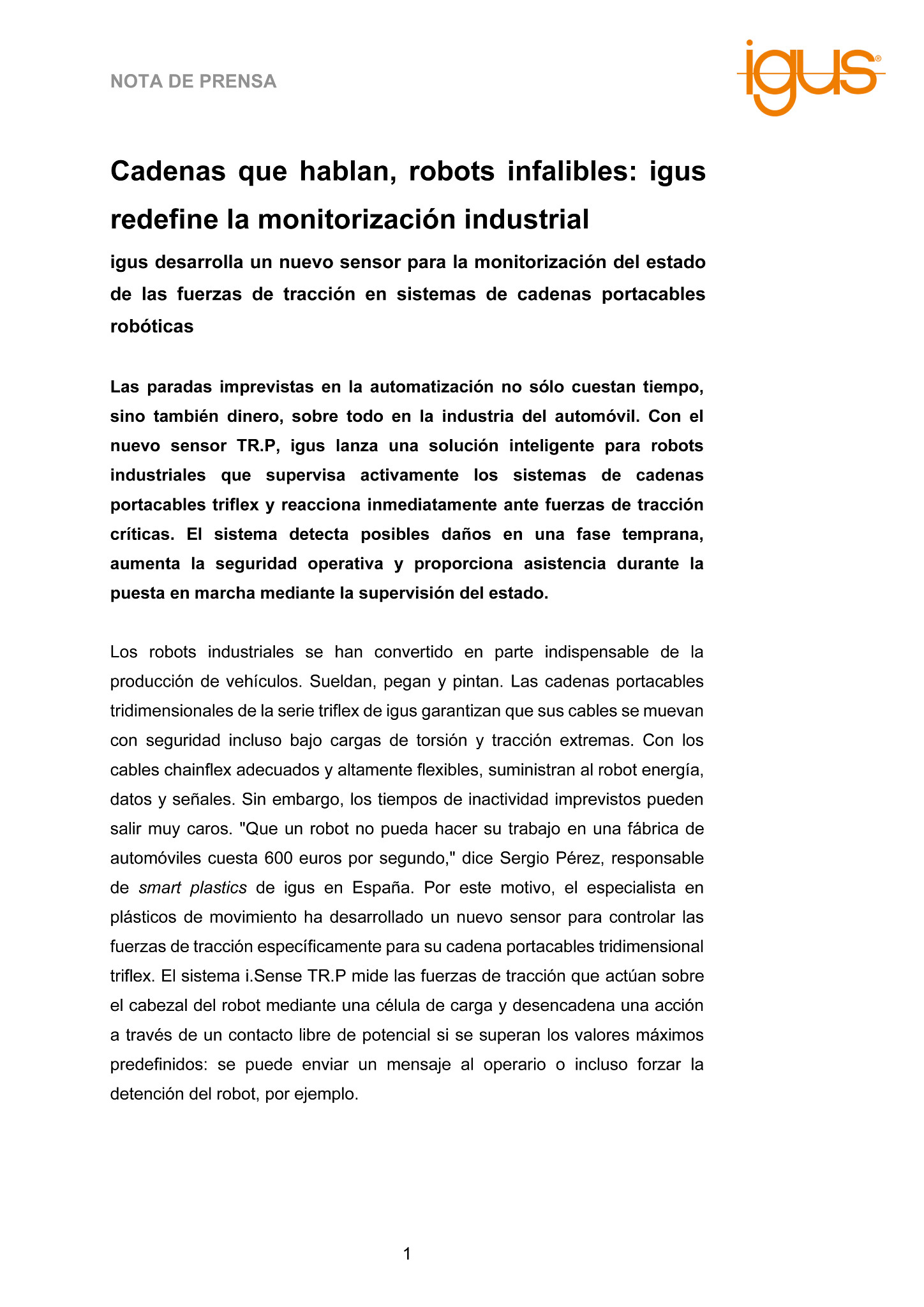 Los robots industriales se han convertido en parte indispensable de la producción de vehículos. Sueldan, pegan y pintan. Las cadenas portacables tridimensionales de la serie triflex de igus garantizan que sus cables se muevan con seguridad incluso bajo cargas de torsión y tracción extremas. Con los cables chainflex adecuados y altamente flexibles, suministran al robot energía, datos y señales. Sin embargo, los tiempos de inactividad imprevistos pueden salir muy caros. «Que un robot no pueda hacer su trabajo en una fábrica de automóviles cuesta 600 euros por segundo,» dice Sergio Pérez, responsable de smart plastics de igus en España. Por este motivo, el especialista en plásticos de movimiento ha desarrollado un nuevo sensor para controlar las fuerzas de tracción específicamente para su cadena portacables tridimensional triflex. El sistema i.Sense TR.P mide las fuerzas de tracción que actúan sobre el cabezal del robot mediante una célula de carga y desencadena una acción a través de un contacto libre de potencial si se superan los valores máximos predefinidos: se puede enviar un mensaje al operario o incluso forzar la detención del robot, por ejemplo.