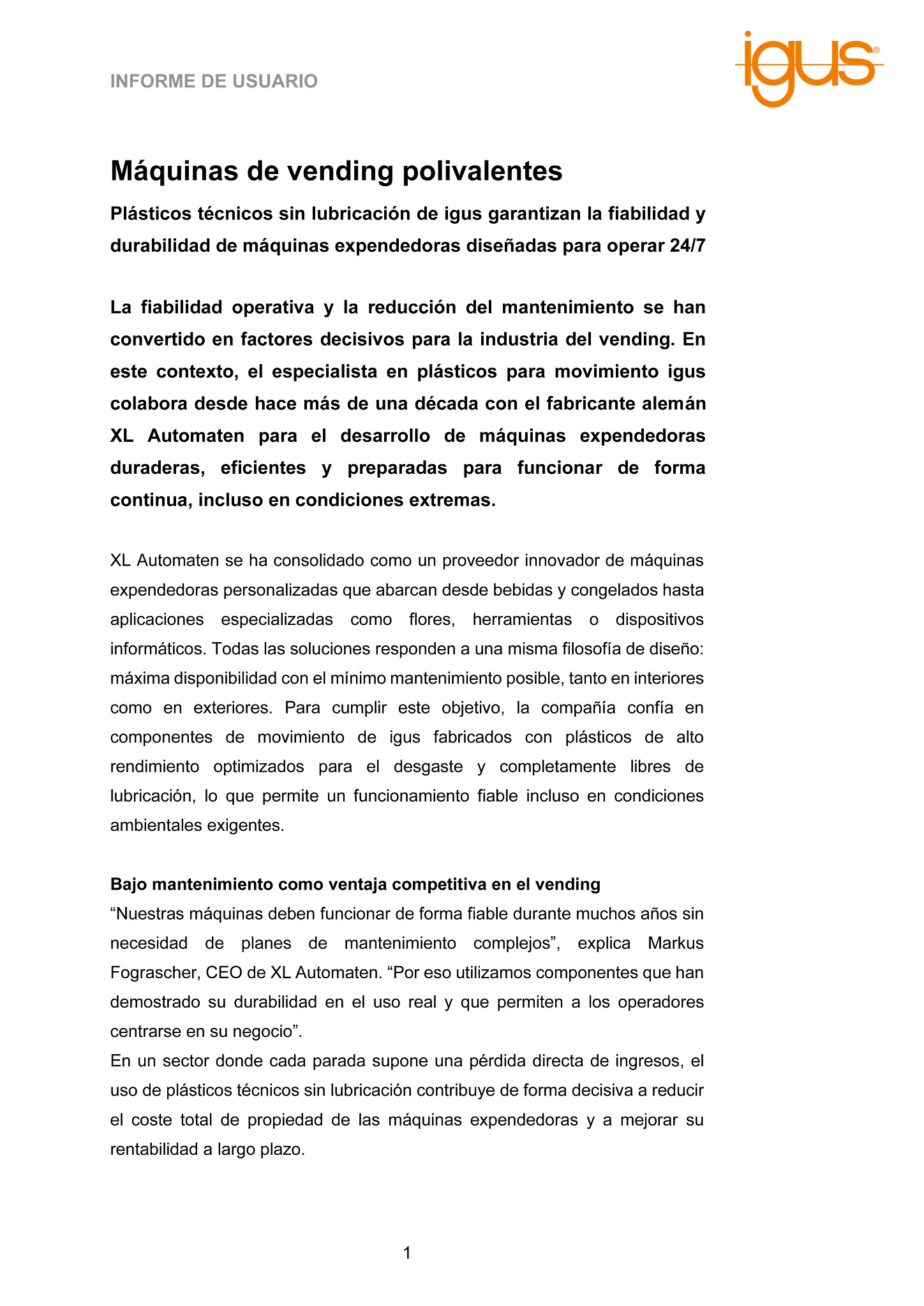 Desde la perspectiva de igus, la colaboración con XL Automaten es un ejemplo de cómo los plásticos para movimiento pueden aportar un valor real a la industria del vending. “Nuestros componentes están diseñados para ofrecer una larga vida útil, bajo mantenimiento y un funcionamiento fiable, características especialmente relevantes para las máquinas expendedoras”, explica Andrej Schmidt, responsable de Industria de Máquinas de Vending en igus.