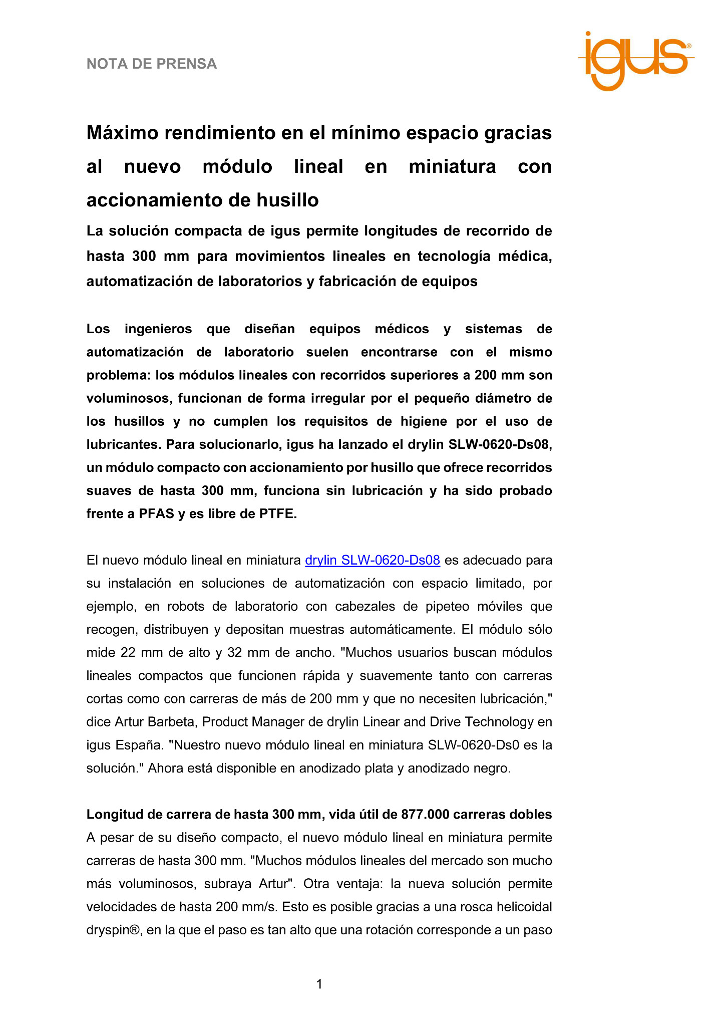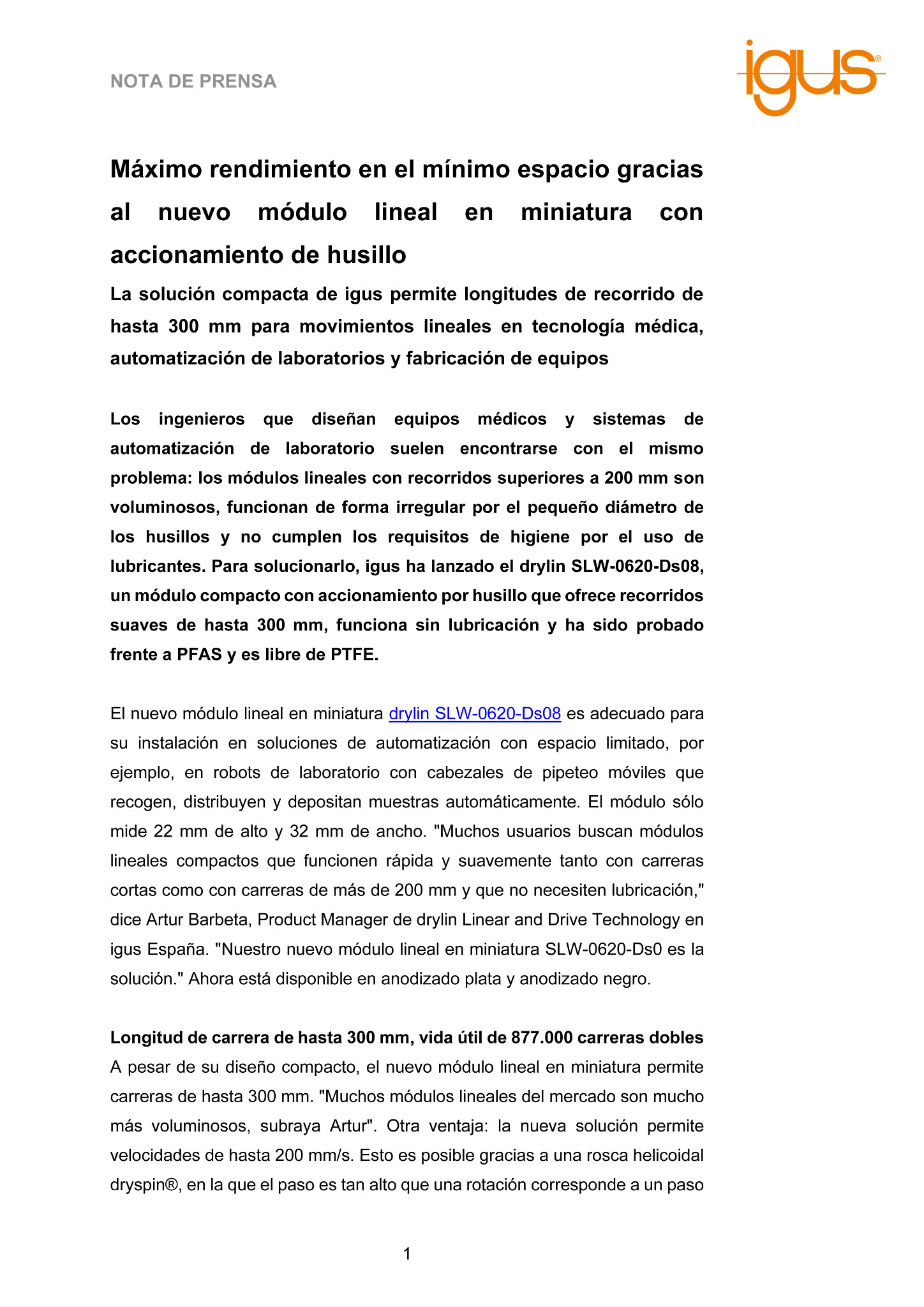 Los ingenieros que diseñan equipos médicos y sistemas de automatización de laboratorio suelen encontrarse con el mismo problema: los módulos lineales con recorridos superiores a 200 mm son voluminosos, funcionan de forma irregular por el pequeño diámetro de los husillos y no cumplen los requisitos de higiene por el uso de lubricantes. Para solucionarlo, igus ha lanzado el drylin SLW-0620-Ds08, un módulo compacto con accionamiento por husillo que ofrece recorridos suaves de hasta 300 mm, funciona sin lubricación y ha sido probado frente a PFAS y es libre de PTFE.