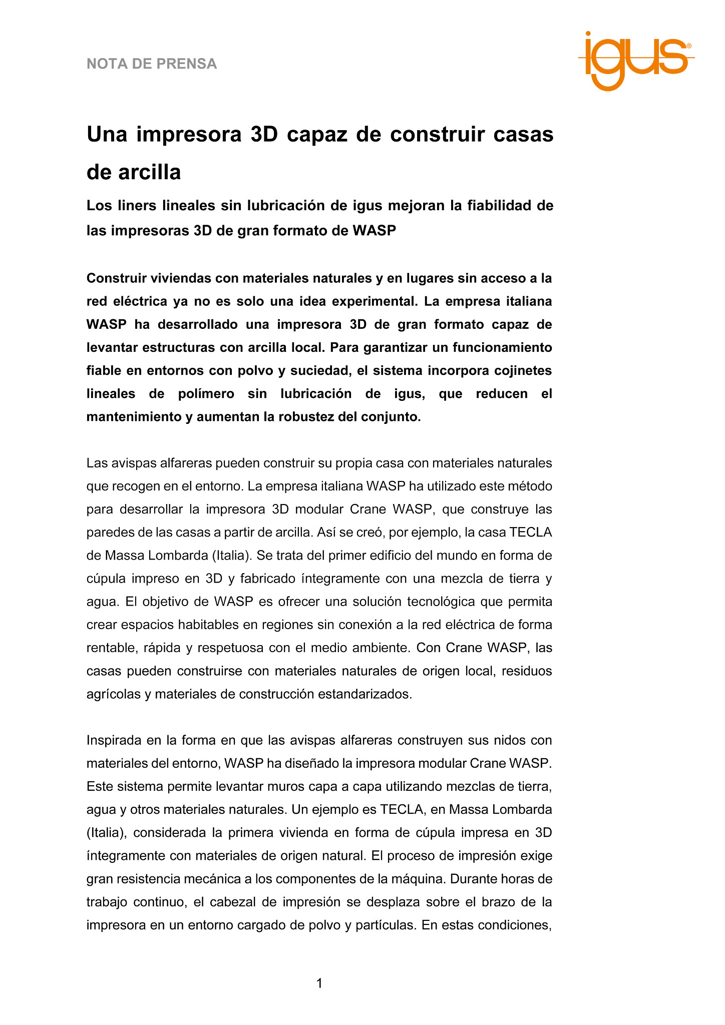 Inspirada en la forma en que las avispas alfareras construyen sus nidos con materiales del entorno, WASP ha diseñado la impresora modular Crane WASP. Este sistema permite levantar muros capa a capa utilizando mezclas de tierra, agua y otros materiales naturales. Un ejemplo es TECLA, en Massa Lombarda (Italia), considerada la primera vivienda en forma de cúpula impresa en 3D íntegramente con materiales de origen natural. El proceso de impresión exige gran resistencia mecánica a los componentes de la máquina. Durante horas de trabajo continuo, el cabezal de impresión se desplaza sobre el brazo de la impresora en un entorno cargado de polvo y partículas. En estas condiciones, los cojinetes metálicos convencionales pueden perder lubricación y sufrir desgaste prematuro.