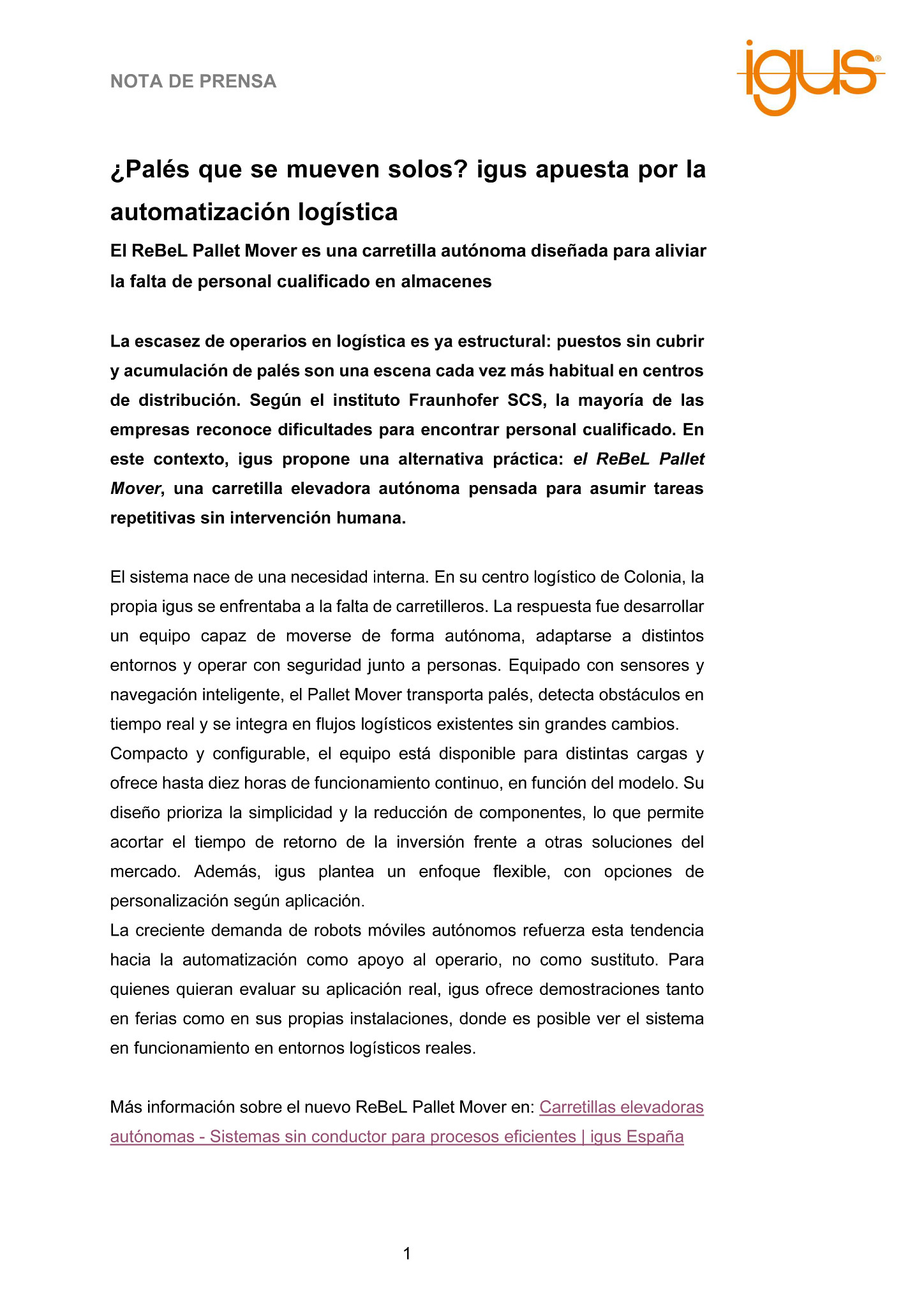 El sistema nace de una necesidad interna. En su centro logístico de Colonia, la propia igus se enfrentaba a la falta de carretilleros. La respuesta fue desarrollar un equipo capaz de moverse de forma autónoma, adaptarse a distintos entornos y operar con seguridad junto a personas. Equipado con sensores y navegación inteligente, el Pallet Mover transporta palés, detecta obstáculos en tiempo real y se integra en flujos logísticos existentes sin grandes cambios.