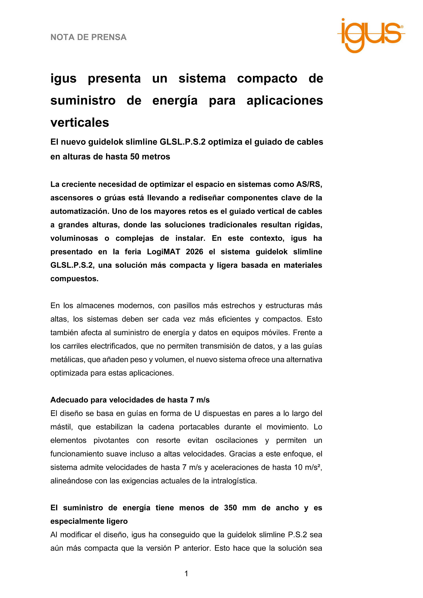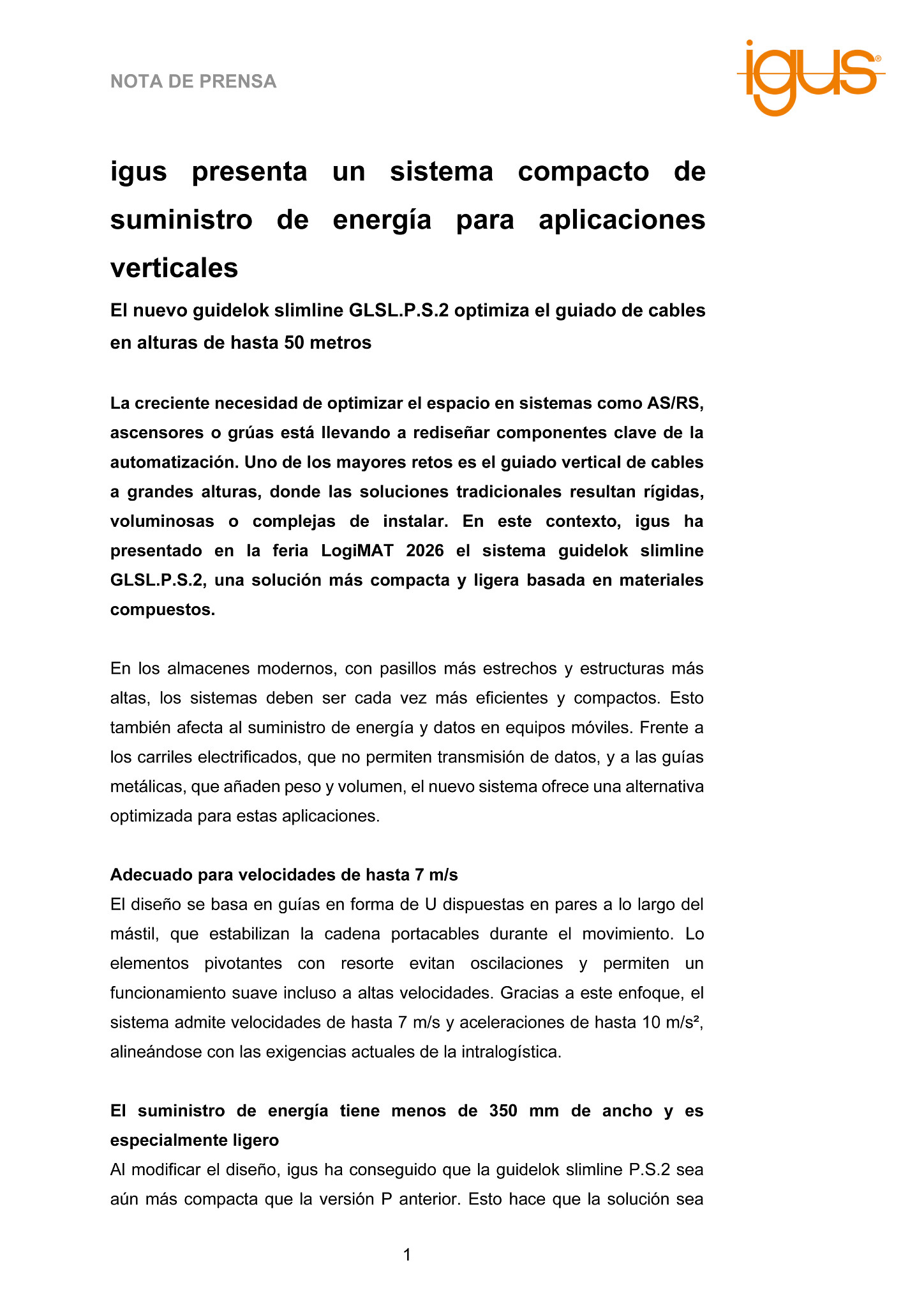 La creciente necesidad de optimizar el espacio en sistemas como AS/RS, ascensores o grúas está llevando a rediseñar componentes clave de la automatización. Uno de los mayores retos es el guiado vertical de cables a grandes alturas, donde las soluciones tradicionales resultan rígidas, voluminosas o complejas de instalar. En este contexto, igus ha presentado en la feria LogiMAT 2026 el sistema guidelok slimline GLSL.P.S.2, una solución más compacta y ligera basada en materiales compuestos.