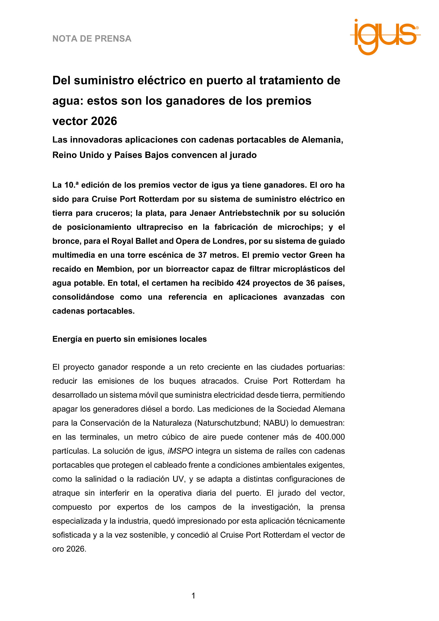 La 10.ª edición de los premios vector de igus ya tiene ganadores. El oro ha sido para Cruise Port Rotterdam por su sistema de suministro eléctrico en tierra para cruceros; la plata, para Jenaer Antriebstechnik por su solución de posicionamiento ultrapreciso en la fabricación de microchips; y el bronce, para el Royal Ballet and Opera de Londres, por su sistema de guiado multimedia en una torre escénica de 37 metros. El premio vector Green ha recaído en Membion, por un biorreactor capaz de filtrar microplásticos del agua potable. En total, el certamen ha recibido 424 proyectos de 36 países, consolidándose como una referencia en aplicaciones avanzadas con cadenas portacables.