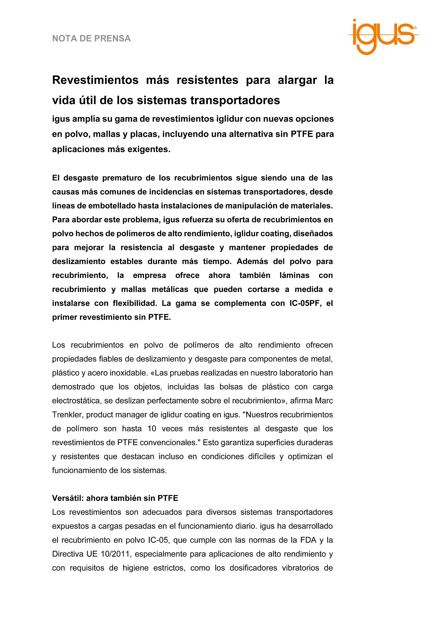 El desgaste prematuro de los recubrimientos sigue siendo una de las causas más comunes de incidencias en sistemas transportadores, desde líneas de embotellado hasta instalaciones de manipulación de materiales. Para abordar este problema, igus refuerza su oferta de recubrimientos en polvo hechos de polímeros de alto rendimiento, iglidur coating, diseñados para mejorar la resistencia al desgaste y mantener propiedades de deslizamiento estables durante más tiempo. Además del polvo para recubrimiento, la empresa ofrece ahora también láminas con recubrimiento y mallas metálicas que pueden cortarse a medida e instalarse con flexibilidad. La gama se complementa con IC-05PF, el primer revestimiento sin PTFE.