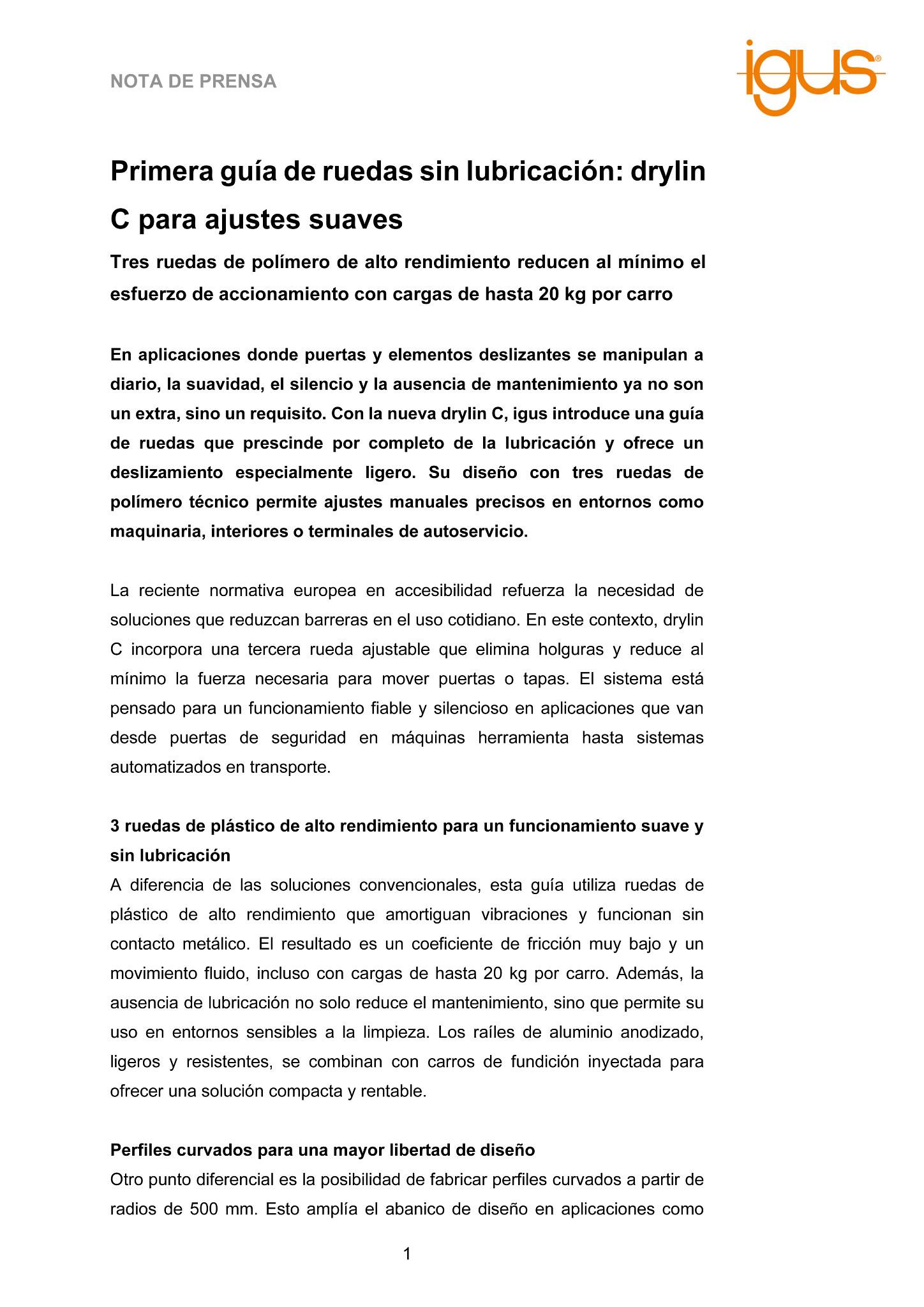 En aplicaciones donde puertas y elementos deslizantes se manipulan a diario, la suavidad, el silencio y la ausencia de mantenimiento ya no son un extra, sino un requisito. Con la nueva drylin C, igus introduce una guía de ruedas que prescinde por completo de la lubricación y ofrece un deslizamiento especialmente ligero. Su diseño con tres ruedas de polímero técnico permite ajustes manuales precisos en entornos como maquinaria, interiores o terminales de autoservicio.